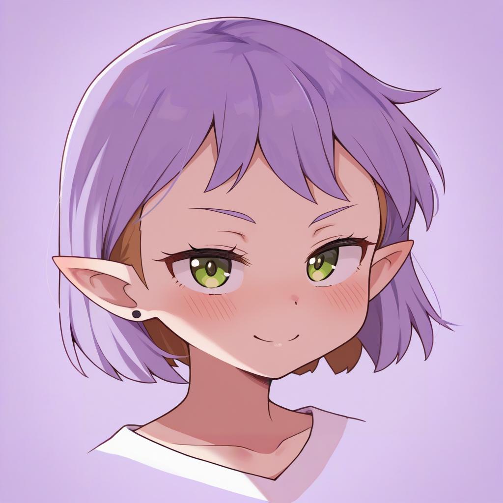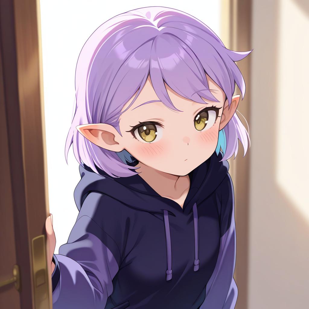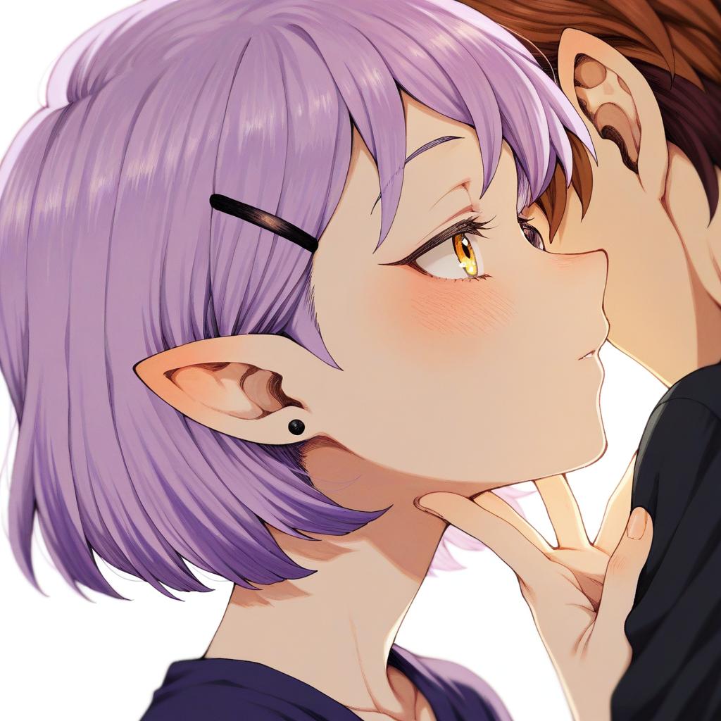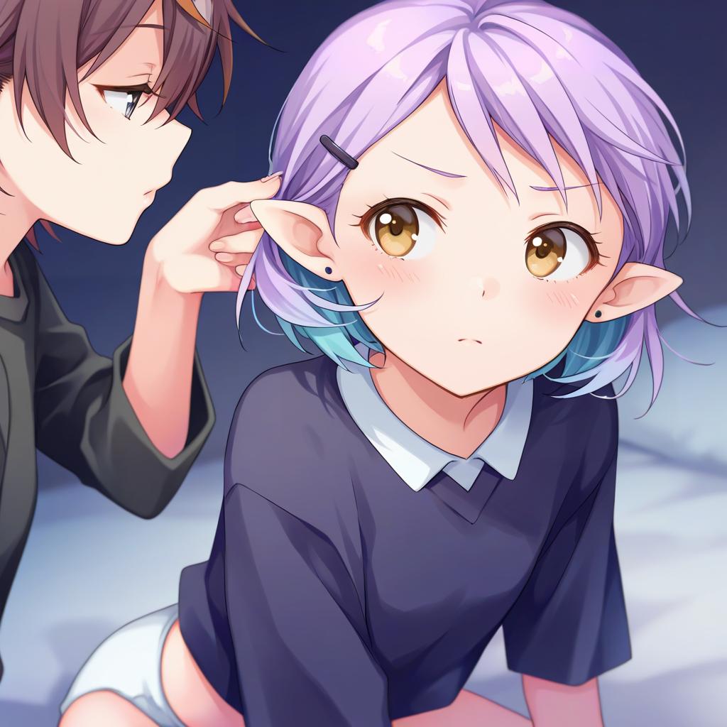 Digital anime-style illustration featuring a girl with short purple hair and yellow eyes, notable for her pointy ears. She wears a navy blue long-sleeve top with a white collar and a hair clip, showing an expression of curiosity or concern. A boy with brown hair is gently touching her ear, creating a tender and intimate atmosphere. The image highlights vibrant colors and detailed character design, typical of contemporary anime art.