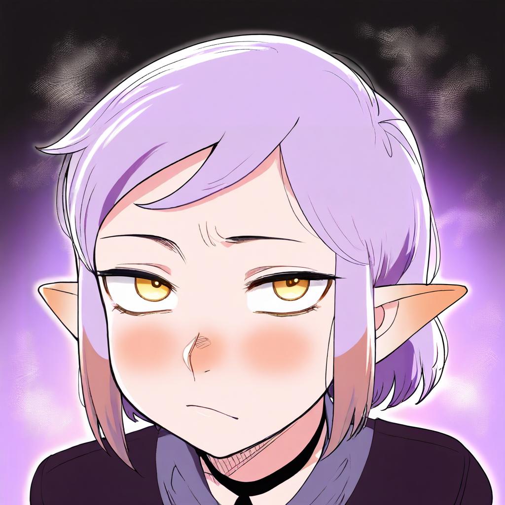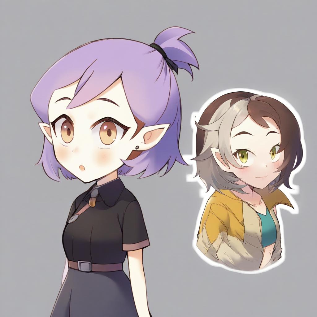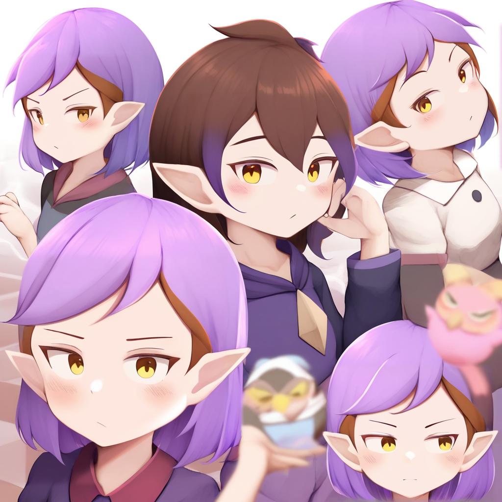 Amity blight, the owl house, 1girl, pointy ears, yellow eyes, purple hair, short hair, brown hair, by artist kuroi (liar-player), illustrious