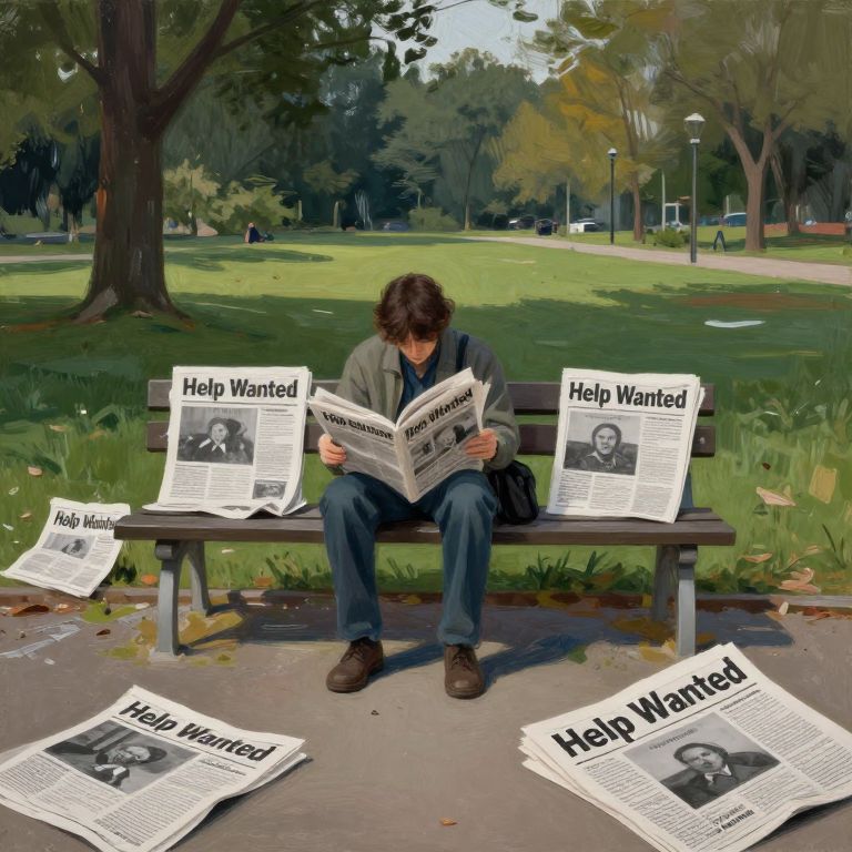 A lone figure sitting on a bench in a park, surrounded by newspapers with large 'Help Wanted' headlines, embodying the theme of unemployment and hope, painted in a melancholic yet hopeful color palette with soft lighting and expressive brushstrokes.