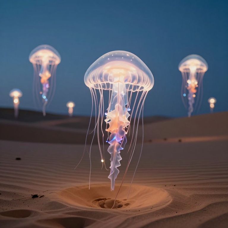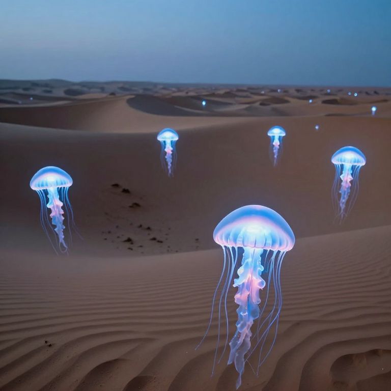 In a surreal 3D-rendered desert landscape bathed in the warm hues of golden hour, a procession of glowing jellyfish-like creatures with light-bulb cores drift serenely across rust-red sands, creating an otherworldly and eerie ambiance.