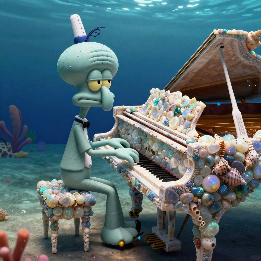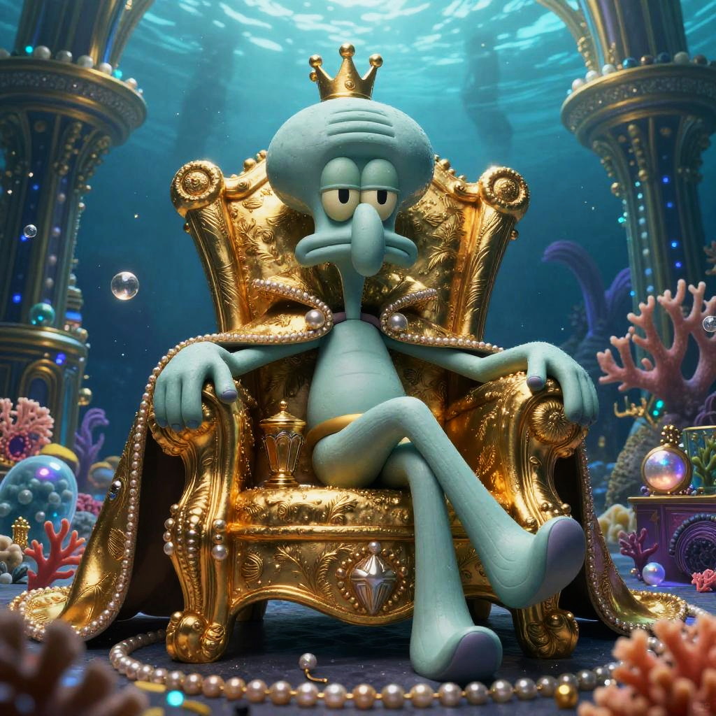 Rich Squidward hosting a glamorous underwater party, elegantly dressed sea creatures mingling around sparkling chandeliers hanging from giant kelp, lavish decorations, bubbles floating, warm golden tones, animated cartoon style.