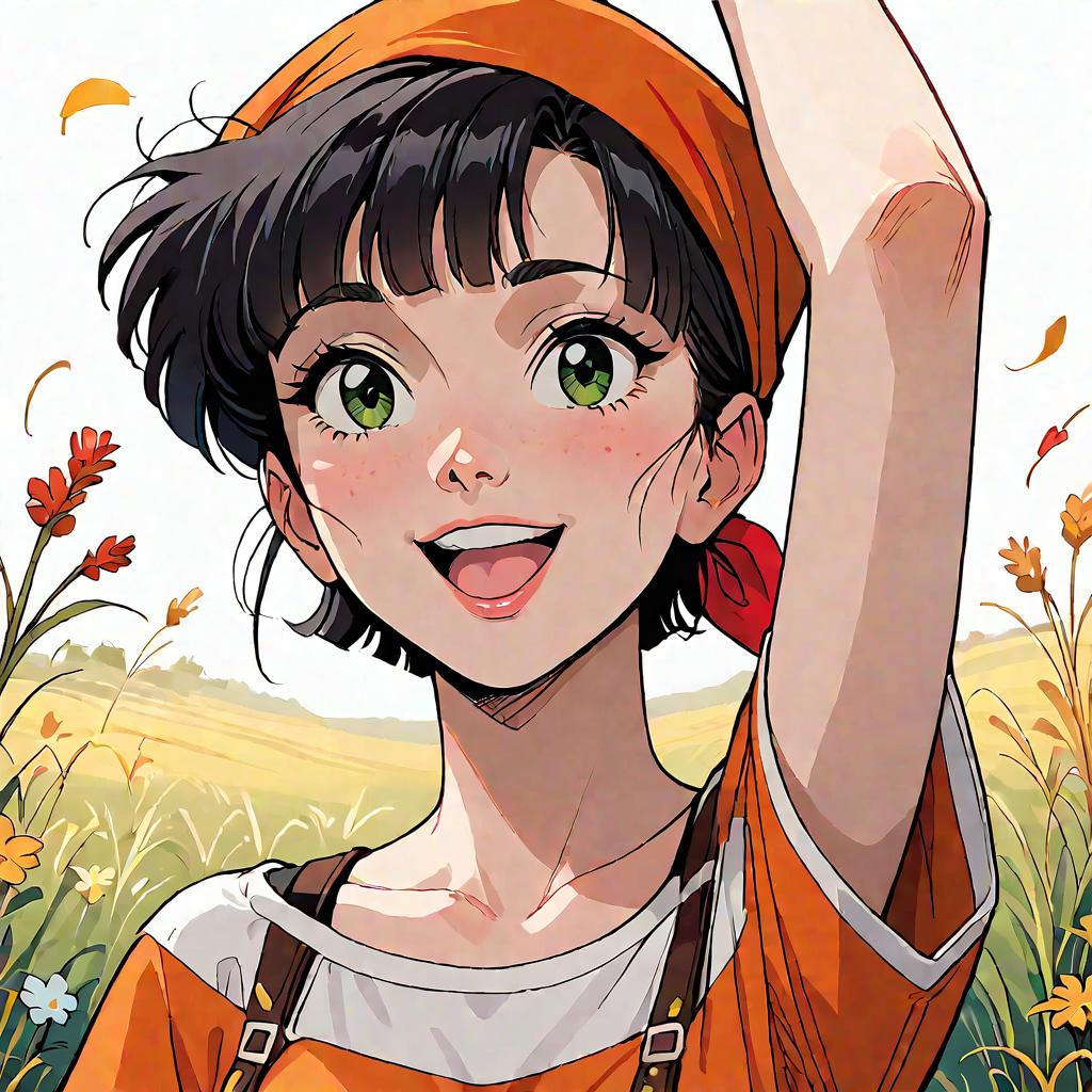 Close-up illustration of a happy anime girl with short black hair and green eyes, wearing an orange bandana and red crop top. She is outdoors in a grassy field with flowers, smiling with her mouth open, raised eyebrows, and one arm up. The artwork is styled in a retro 1990s anime aesthetic.
