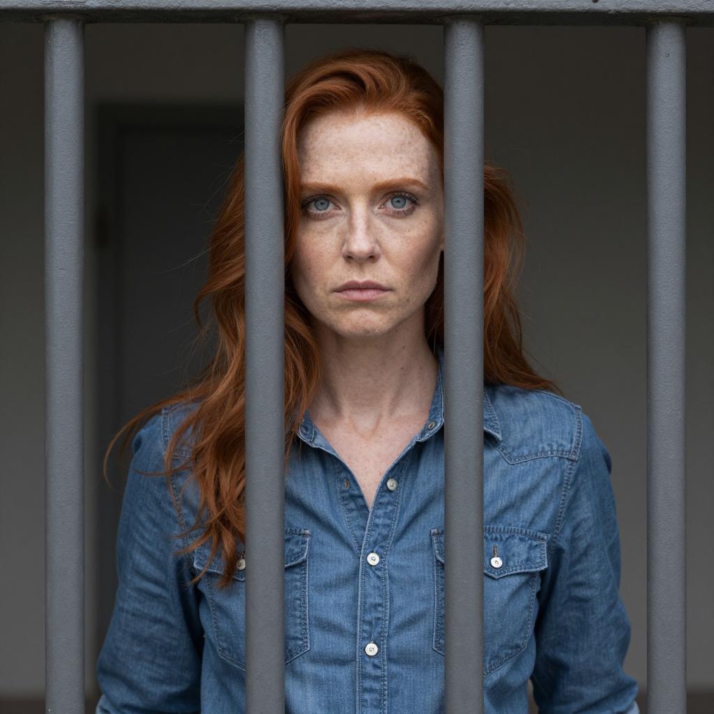 Red-haired woman with messy hair, green shirt, and white apron, shouting into a microphone while washing dishes in a messy kitchen. Multiple bottles, dish rack, and window with blurred forest background. Her mouth is open wide in mid-shout. Her right hand is raised, fingers spread. Sunlight streams through the window, illuminating her face. Her expression is intense and animated. Kitchen counter is cluttered with various bottles and dishes. One green bottle is prominent on the right. Background includes trees and a clear sky.