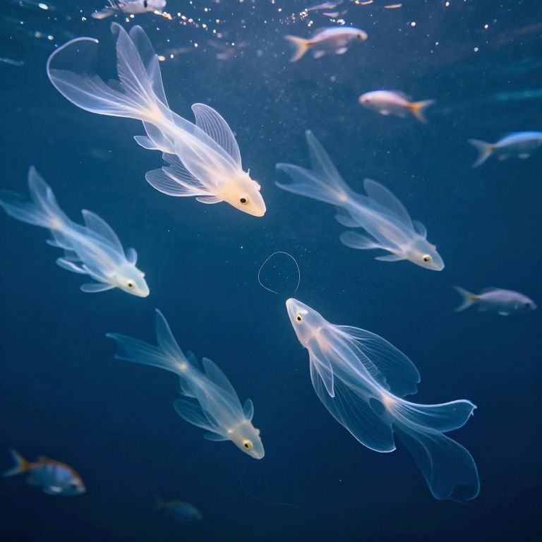 Photograph of a underwater scene featuring six translucent, white-glowing fish with delicate, flowing fins swimming in a deep blue ocean. The fish are clustered together, with one prominently in the center, illuminated by a soft, ethereal light. Background includes a few smaller, more opaque fish and scattered bubbles, creating a sense of depth and motion. The fish's translucent bodies and glowing appearance contrast sharply with the dark blue background, highlighting their graceful forms. The image captures a serene, almost magical underwater ambiance.