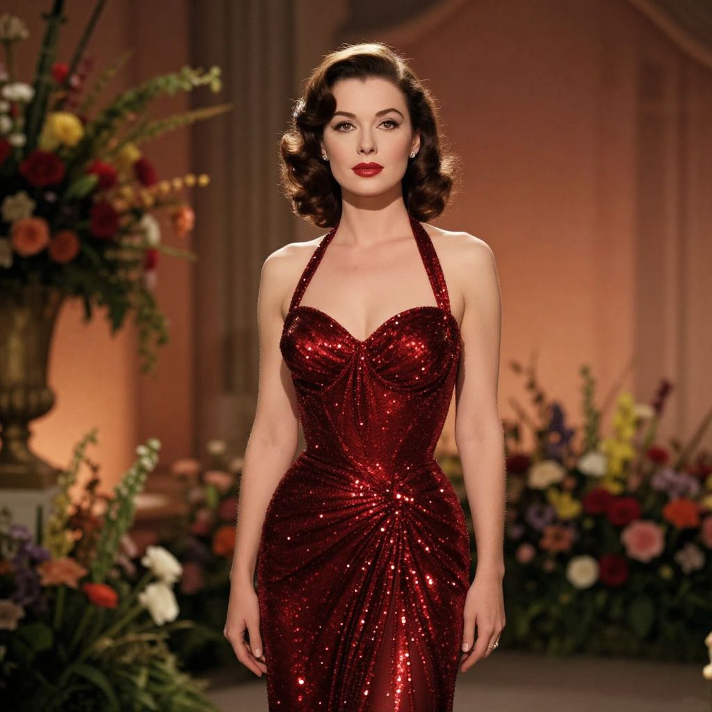 An elegant woman channels the style of classic Hollywood in a sparkling, deep red, halter-neck gown reminiscent of a Cecil B. DeMille era, standing poised amidst a backdrop of warm, ambient lighting and rich floral arrangements.