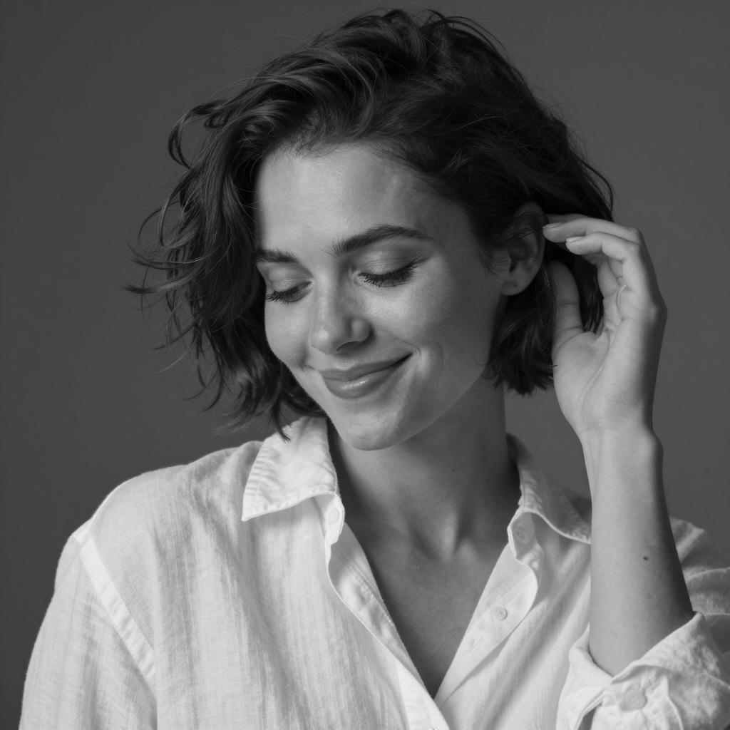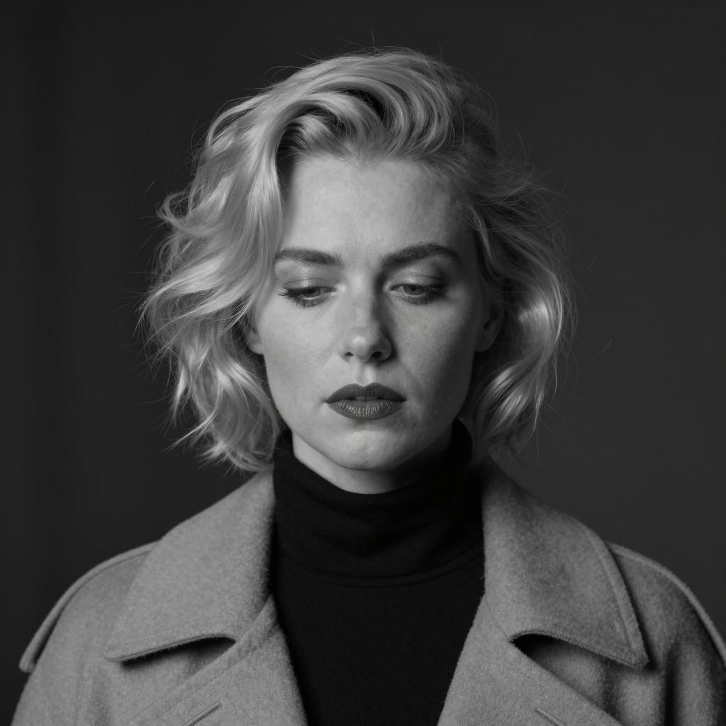 Black and white close-up portrait of two women with serious expressions. The woman on the left has dark curly hair and is wearing a collared shirt. The woman on the right has short blonde hair, wears a light-colored top, and poses with her finger touching her lips. Both are positioned closely against a plain white background.