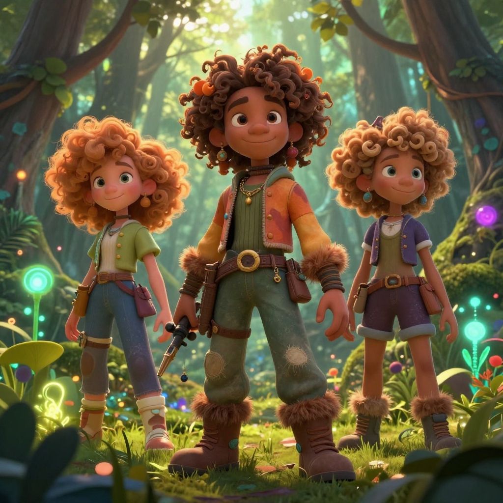 Three curly-haired, cartoon children in forest, glowing mushrooms, vibrant lights; central child wears green overalls, side children in green and blue outfits;