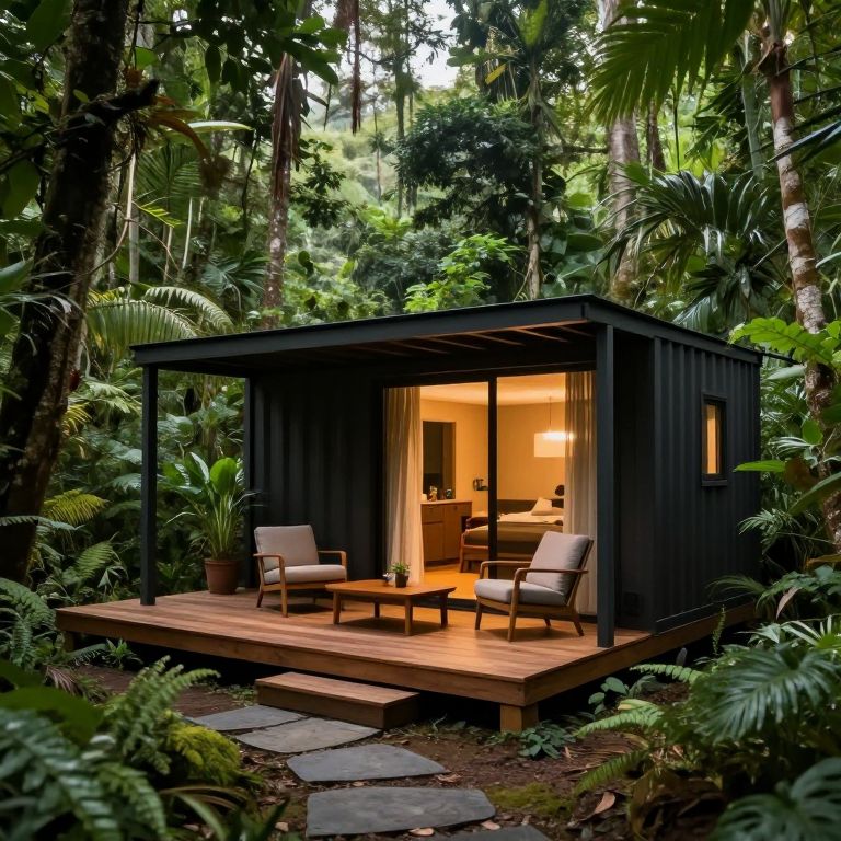 Charming backyard art studio featuring a cozy outdoor seating area with a red-and-white striped lounge chair and ottoman, a woven side table, and two potted plants flanking the entrance, all set against a backdrop of lush greenery and a wooden fence. Inside, a warm and inviting space reveals a wooden dining table surrounded by chairs, a small window, and soft lighting, creating a serene retreat perfect for creativity and relaxation.