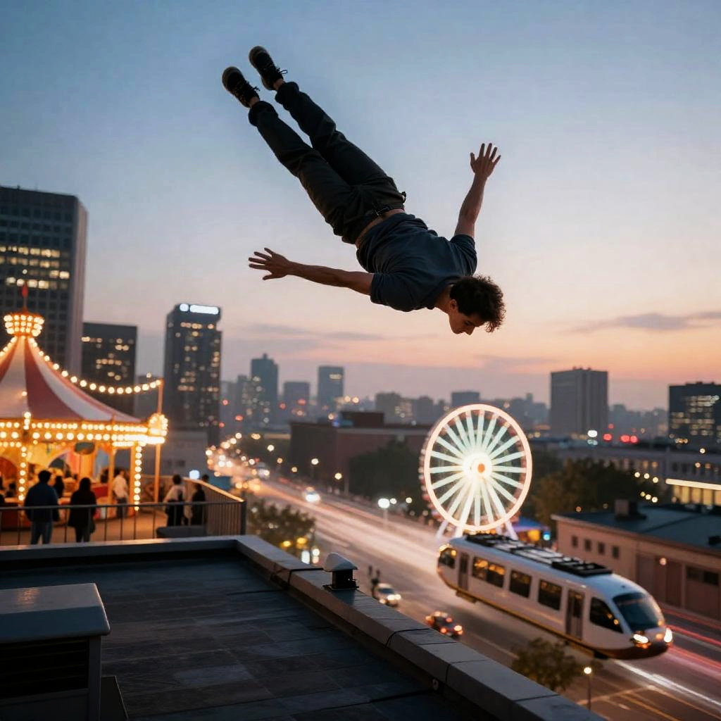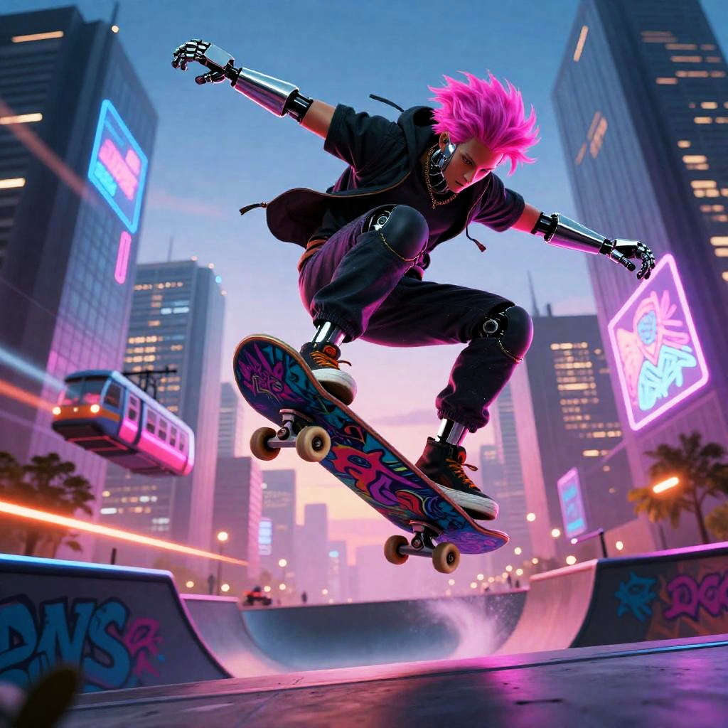 Modern comic book image in the style of Dan Mora depicting a fantasy heroine soaring through the air above a bustling city, with a futuristic skyline, colorful fireworks adding a sense of speed and action to the composition.