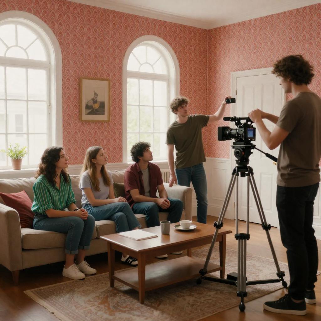 Photograph of three people in a cozy, sunlit room with green curtains. A man with curly hair and a black shirt leans over a reclining man, who is smiling, while another man with short brown hair and glasses holds a camera, taking a photo. The man with curly hair rests his hand on the reclining man's face.