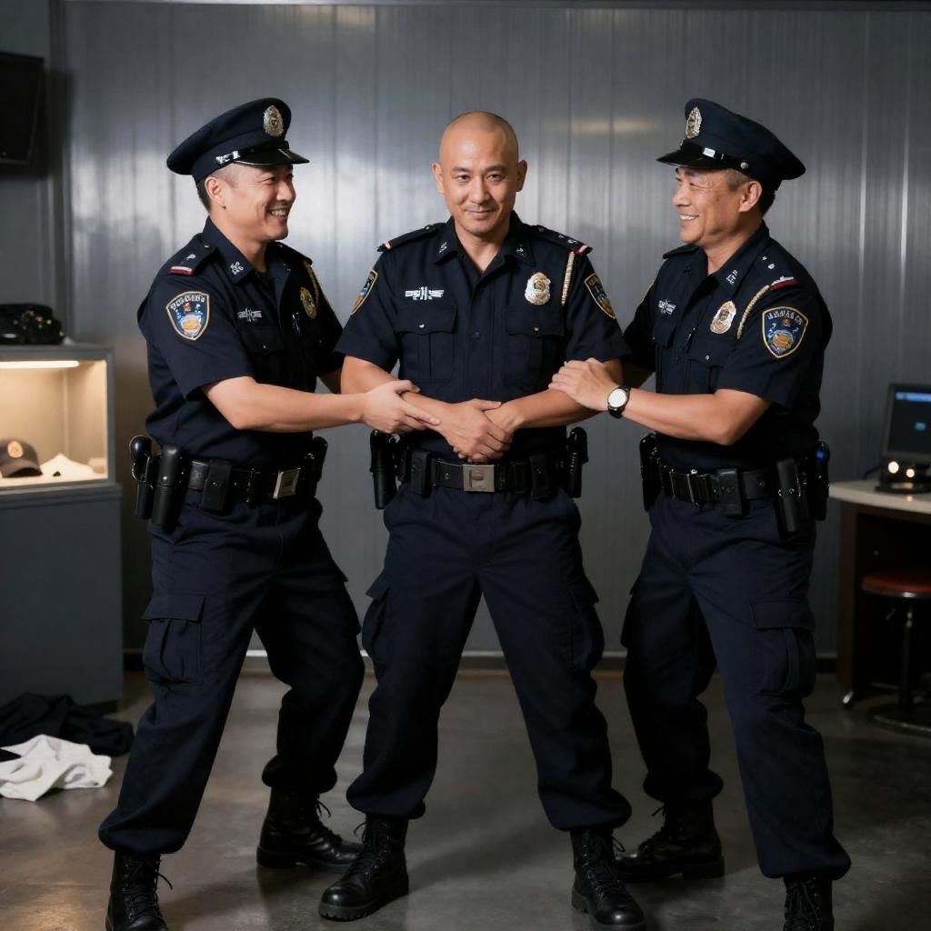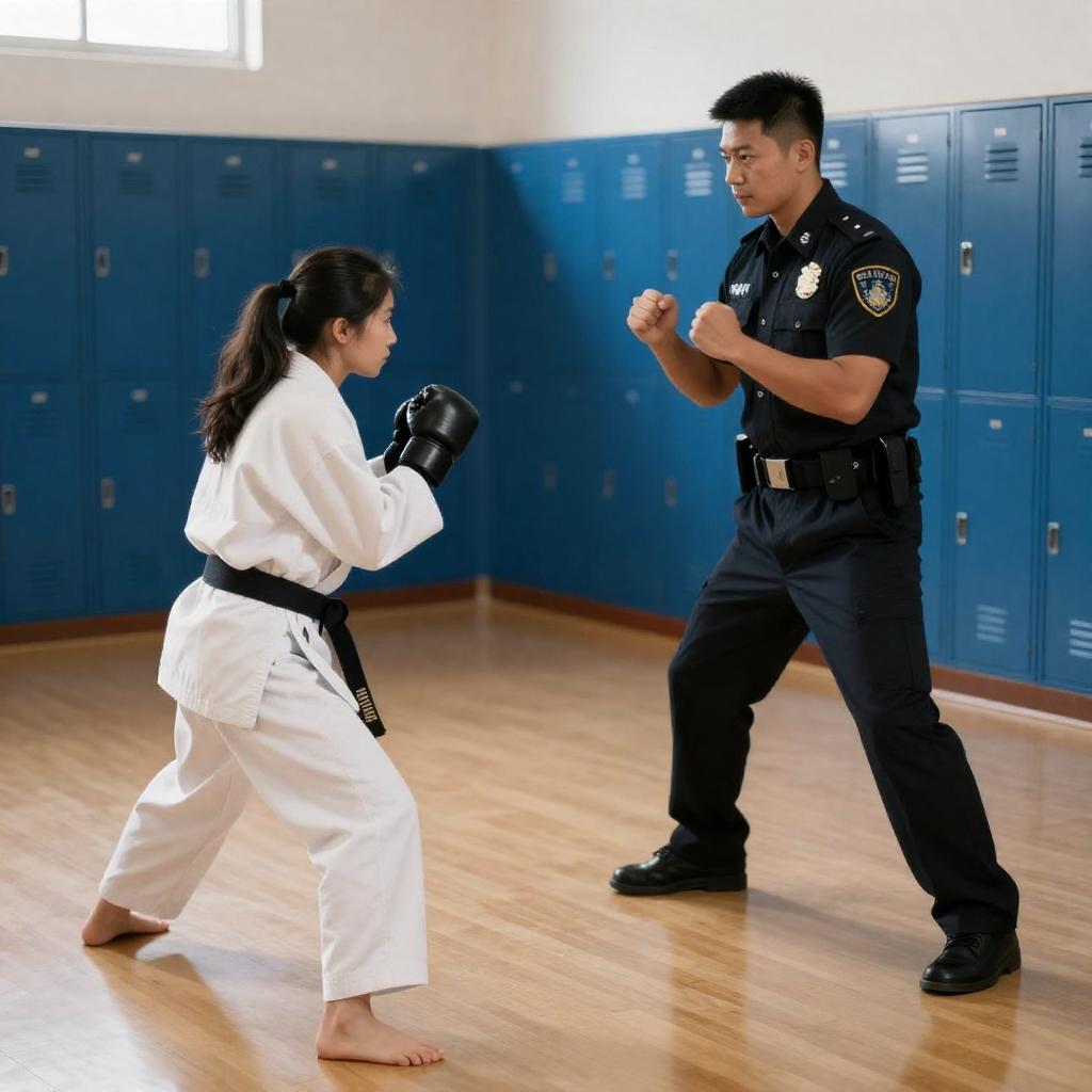 Photograph of a martial arts scene in a locker room. A woman in a white gi and black gloves crouches, ready to strike, facing a male police officer in a black uniform. Blue lockers and a wooden floor form the background. The officer stands with a defensive posture, hands raised. Bright light from a window illuminates the scene.