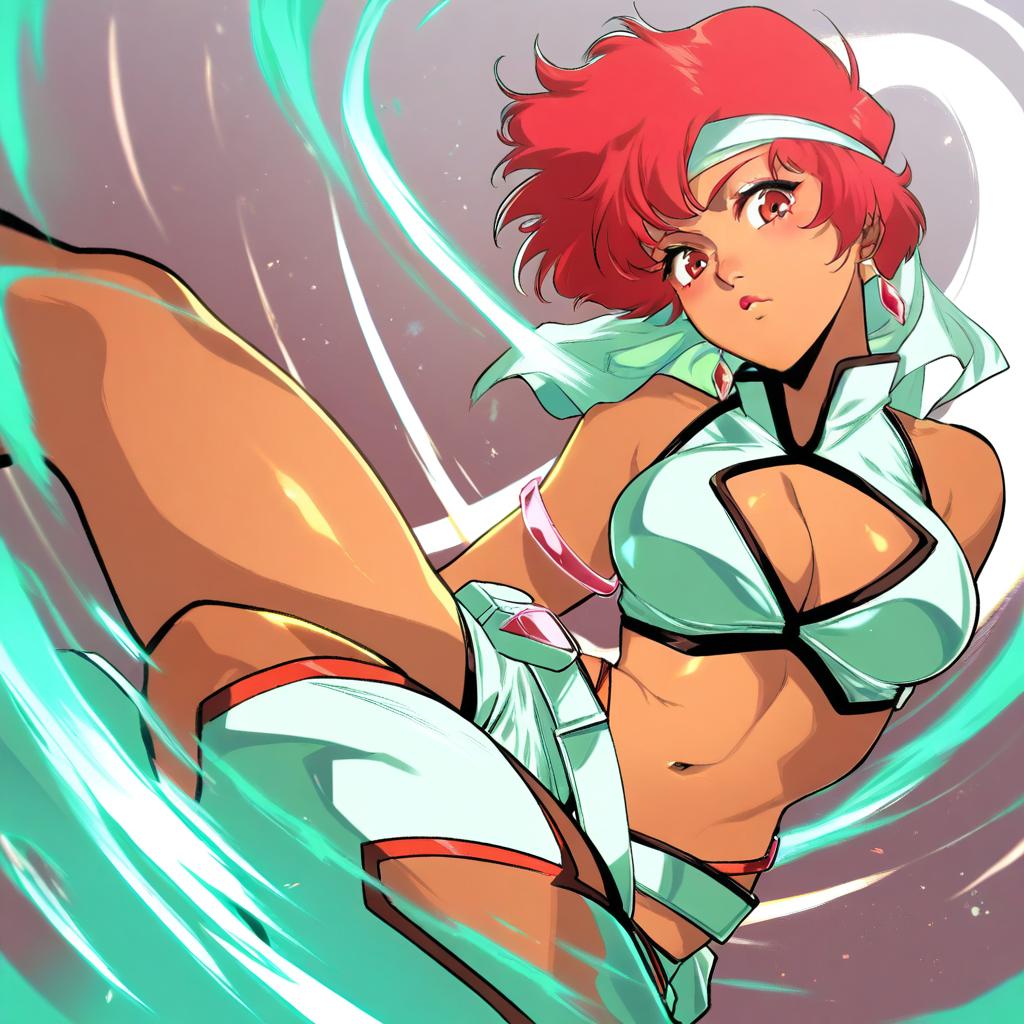 Kei (dirty pair), dirty pair, 1girl, dark-skinned female, red eyes, red hair, short hair, large breasts, medium breasts, cleavage, navel, earrings, crop top, headband, midriff, by artist kukumomo, animagine