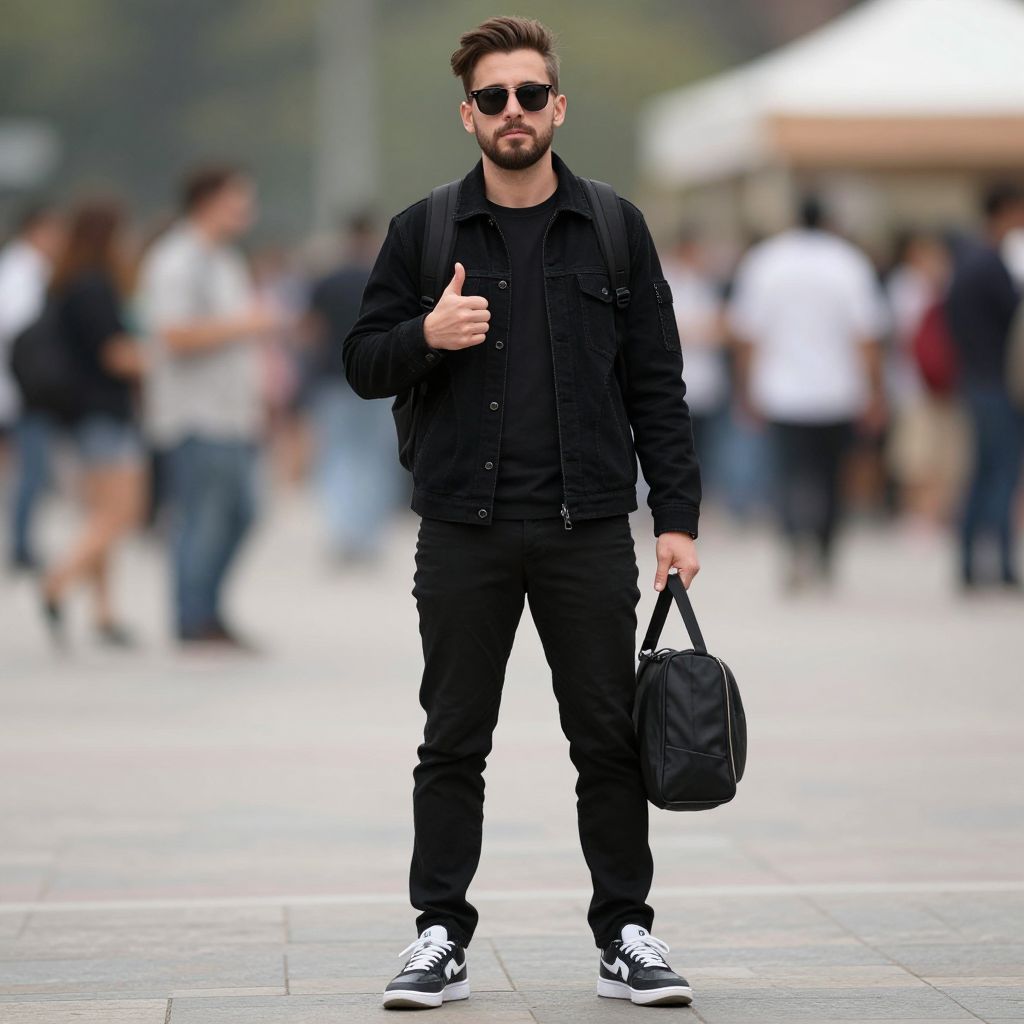 Pun party costume, male focus, 1boy, sneakers, jacket, sunglasses, thumbs up, hand in pocket, shoes, pants, facial hair, brown hair, backpack, black jacket, full body, bag, black pants, outdoors, blurry, blurry background