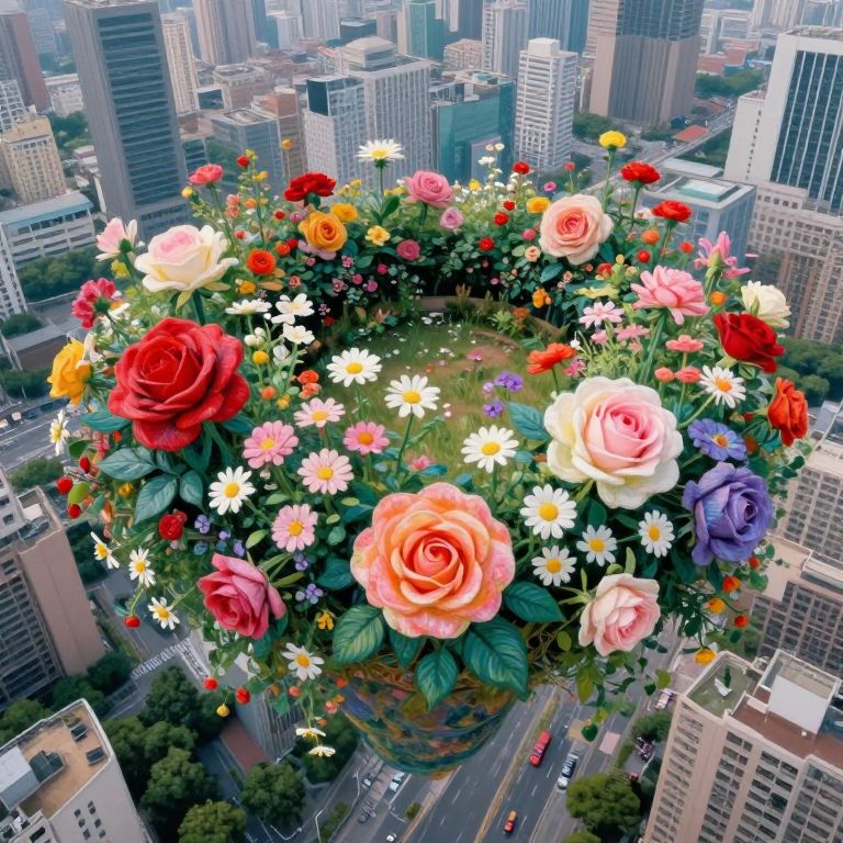 Envision a surreal vista where an expansive garden brimming with vibrant blooms seems to hover above a bustling metropolis, as viewed from an aerial perspective. This captivating scene showcases the meticulous intricacies of the flourishing flora, including oversized roses painted in bold strokes reminiscent of post-impressionist techniques and delicate daisies that evoke the soft hues of impressionism. The harmonious blend of the tranquil garden with towering urban structures engenders a spectrum of emotions, sparking both awe and contemplation about the interconnectedness of nature and civilization.