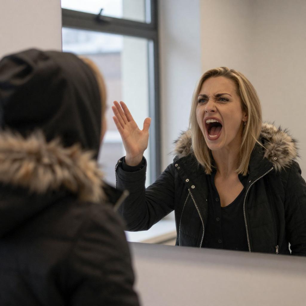 Photograph of a blonde woman with shoulder-length hair, wearing a black jacket, shouting at a person in a black hooded jacket with a fur-lined hood. She stands in front of a mirror, reflecting her intense expression. Windows in the background show a blurry outdoor scene. The woman's right hand is raised, palm up, and her mouth is open wide in a shout. The hooded person's back is to the camera. The mirror divides the scene horizontally.