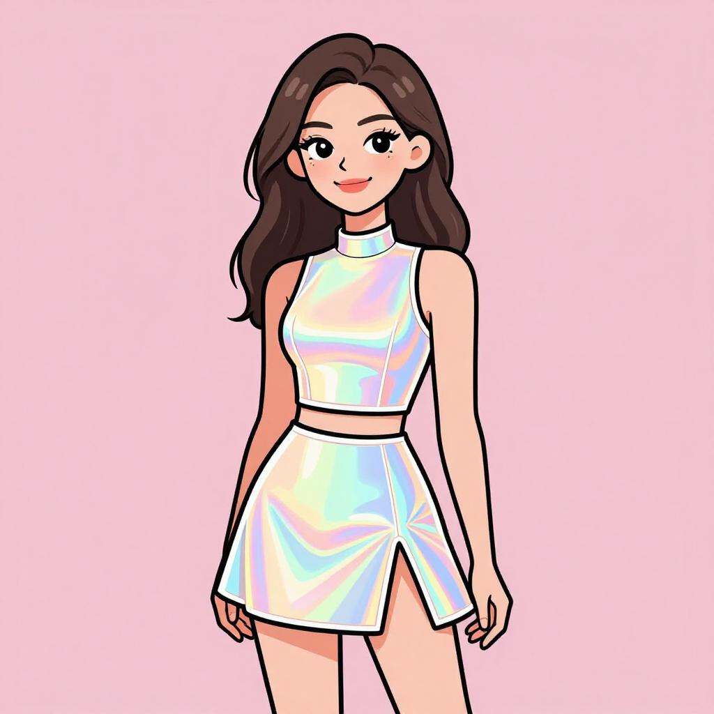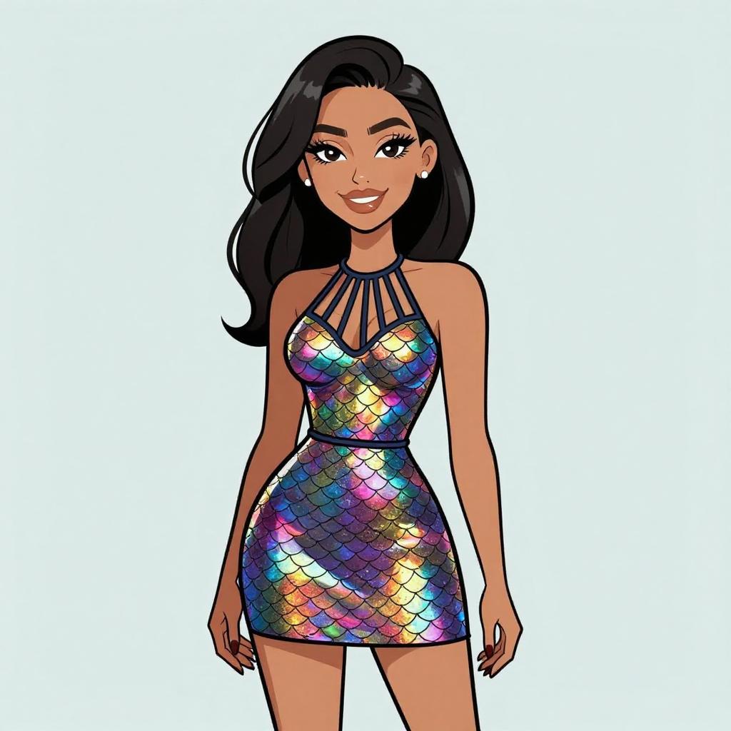 Woman with pretty face and pretty hair. smiling Woman, fantasy-inspired, sleeveless skater dress with metallic fish scale print, high neckline, flared skirt, mini length, choker with matching pattern, wavy blonde hair, neutral background. --sref 1467