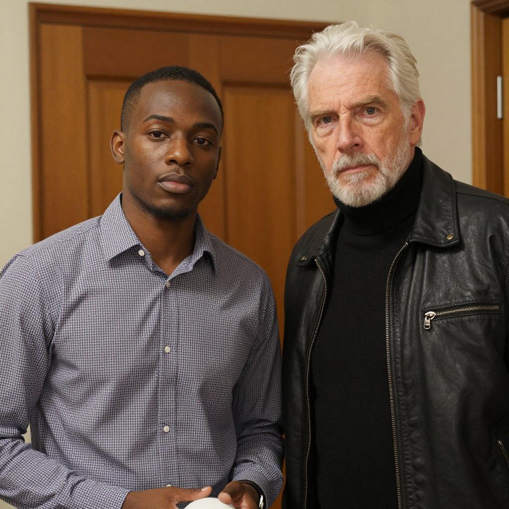 Two men standing indoors. Young Black man with short hair, checkered shirt, neutral expression, holding a white object. Older white man with white hair, beard, black turtleneck, black leather jacket, intense gaze. Wooden door in background. Warm lighting.