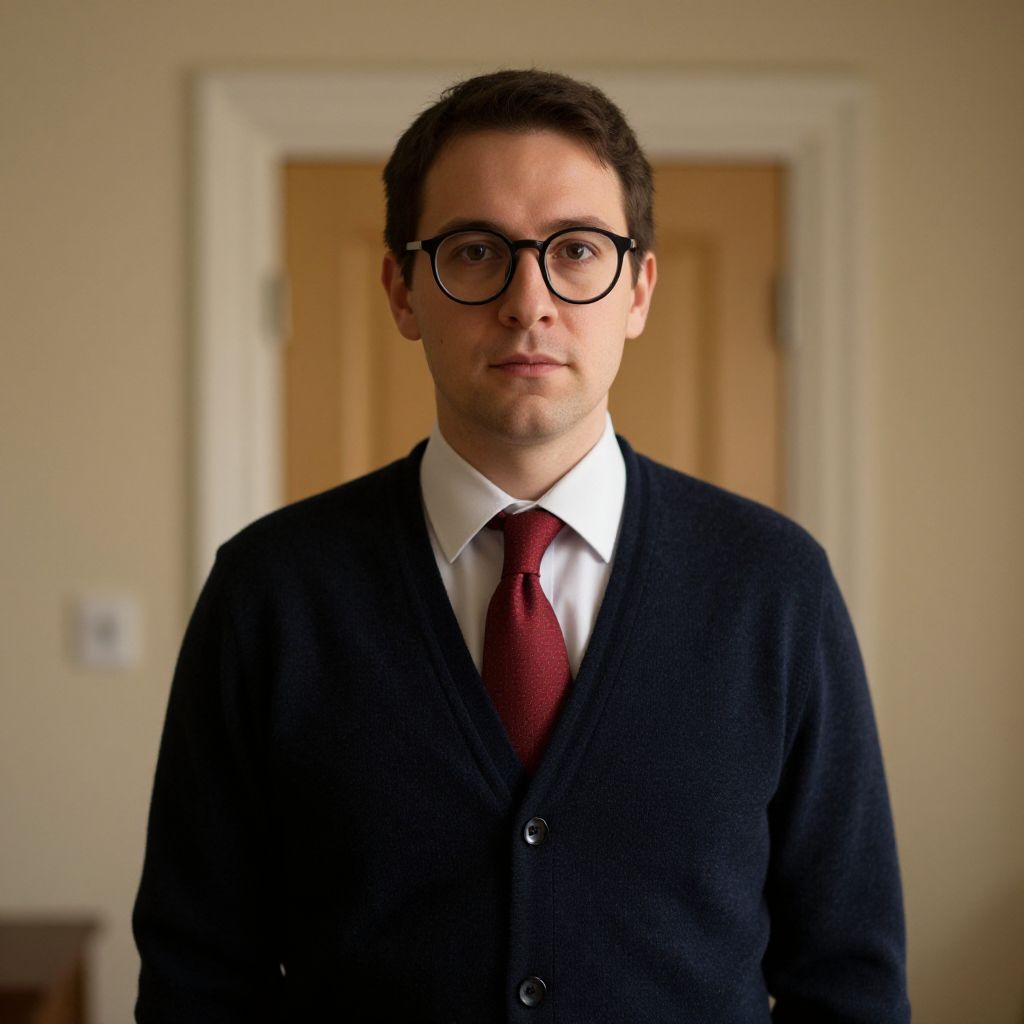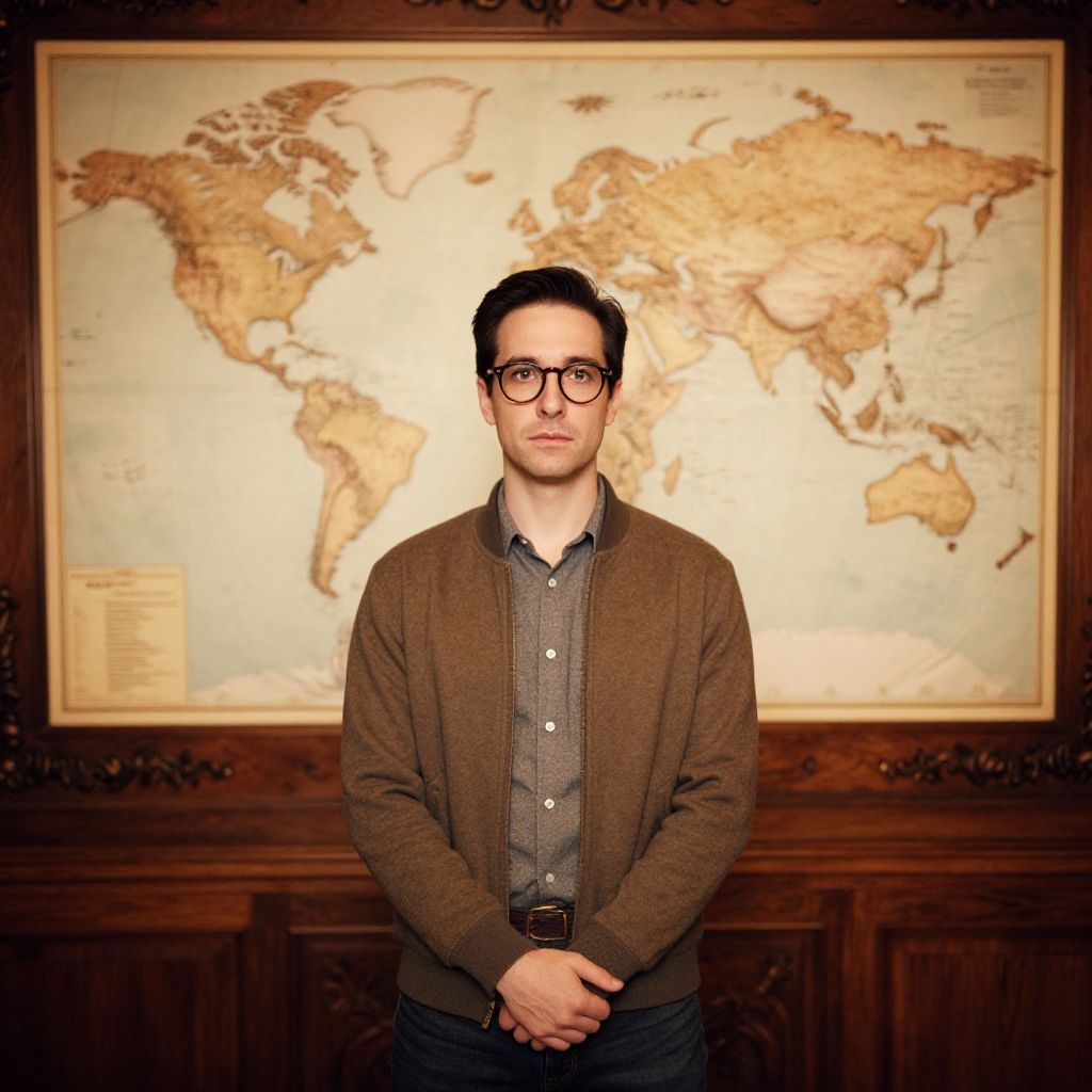 Photograph of a young, Caucasian man with short, dark hair and black-framed glasses, standing in front of a large, vintage world map. He wears a brown cardigan over a gray, checkered shirt and dark jeans, with hands clasped in front. The background features an ornate wooden panel with the map centered. The lighting is warm, highlighting the man's face and creating a slight glow around the map. The overall style is classic and scholarly, evoking a sense of intelligence and historical interest.