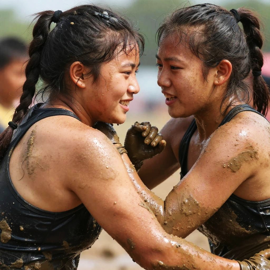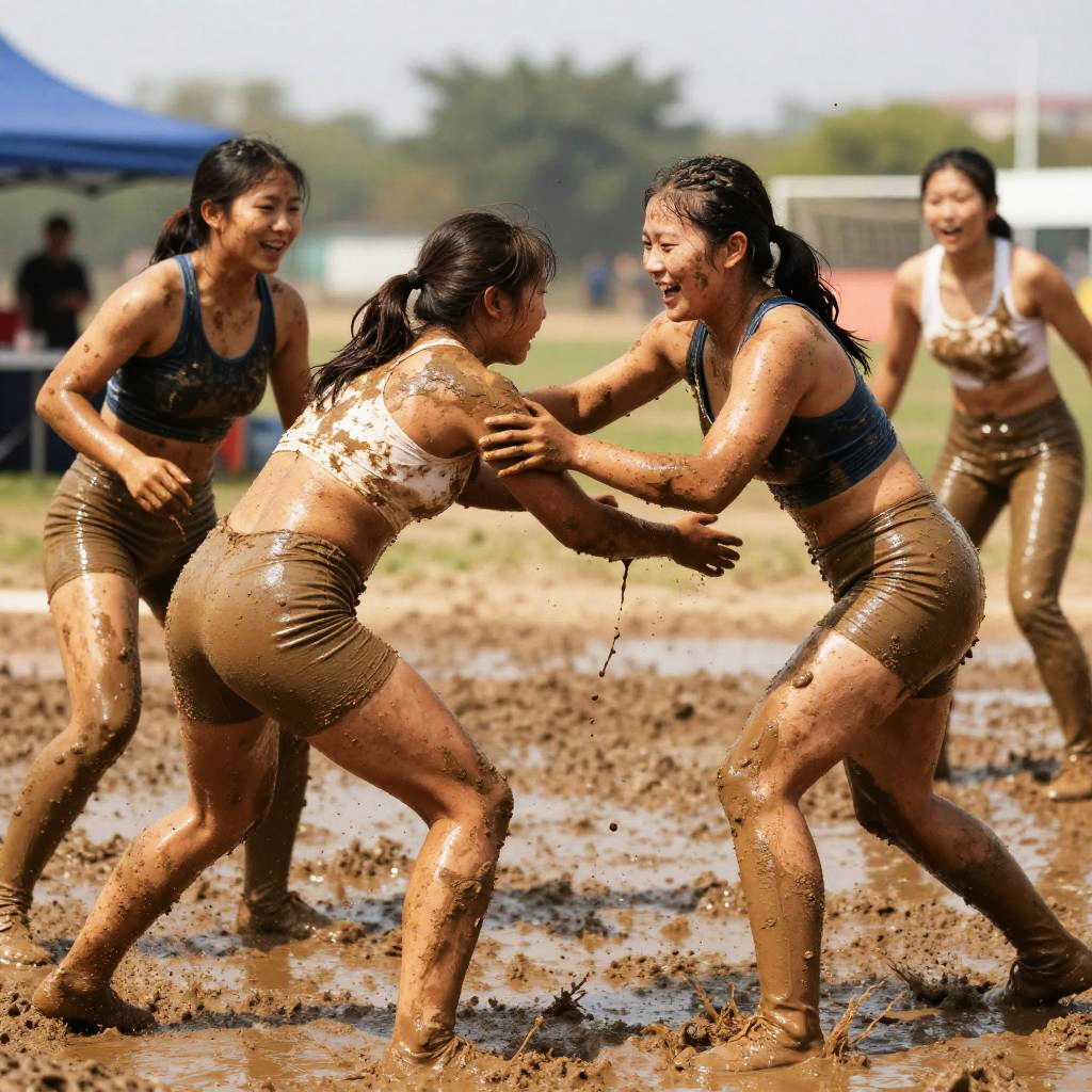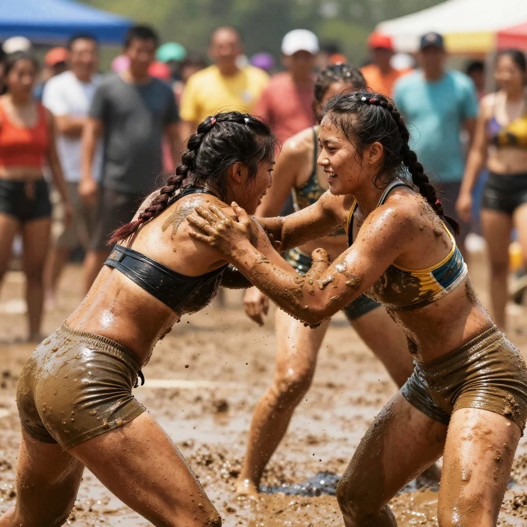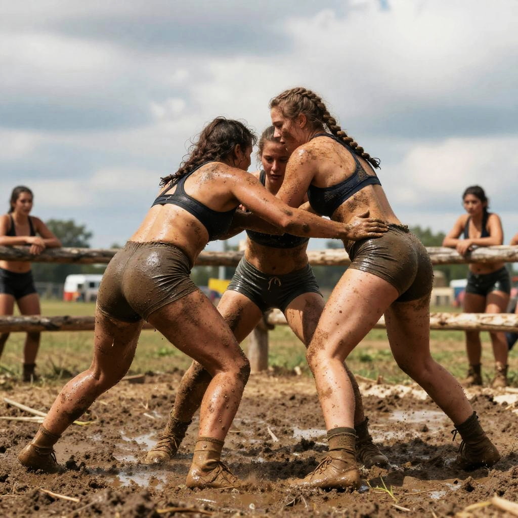 Mud wrestling girls in an energetic outdoor arena, dynamic poses covered in rich brown mud splashes, vibrant expressions of competition and fun, bright natural lighting, realistic textures of mud and skin, athletic and empowered atmosphere.