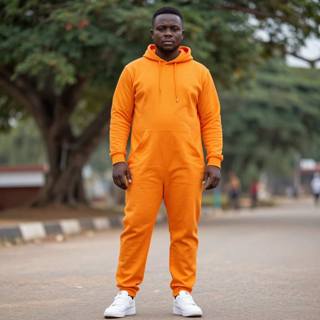 Photograph of a tall, dark-skinned man in bright orange hoodie and pants, standing on a tree-lined street, wearing white sneakers.