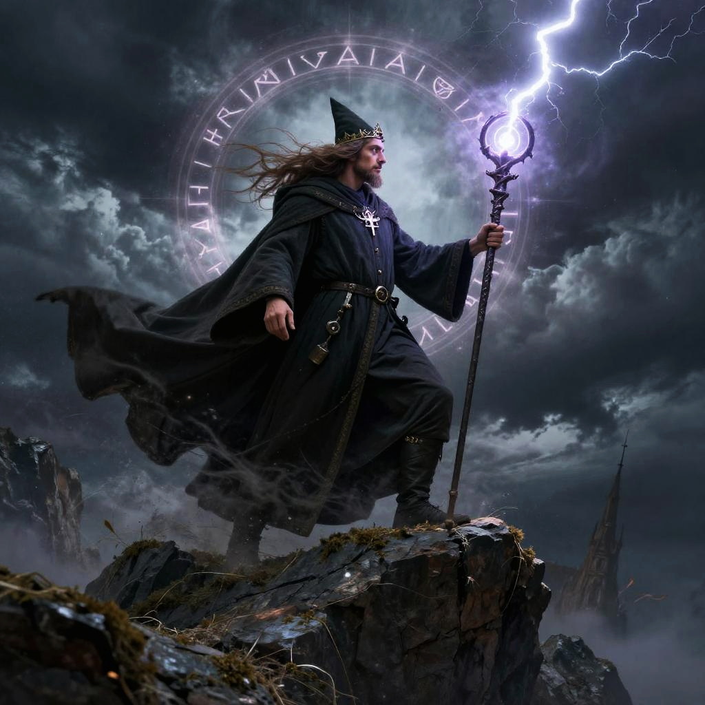 Mystical wizard in dark robes and hat, holding glowing staff, stands on rocky cliff under stormy sky with lightning and magical circle.