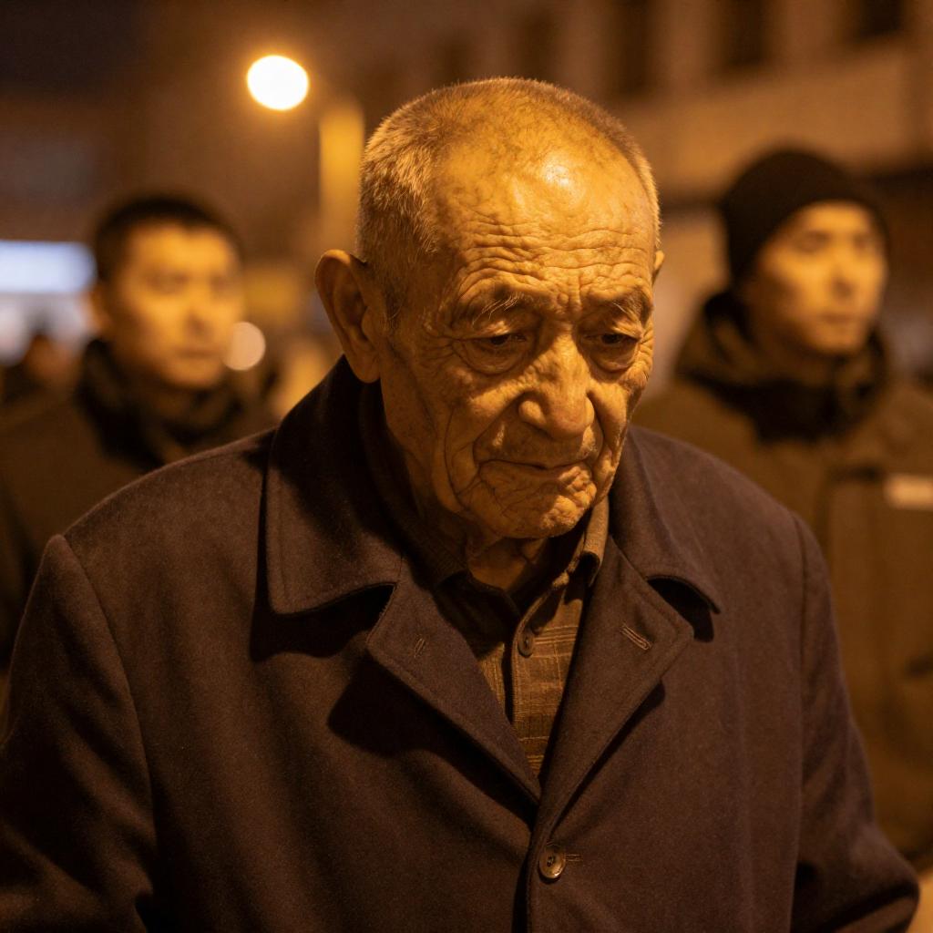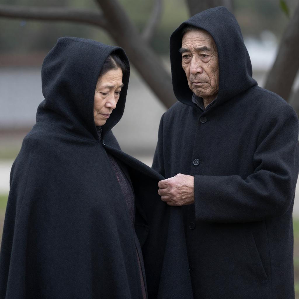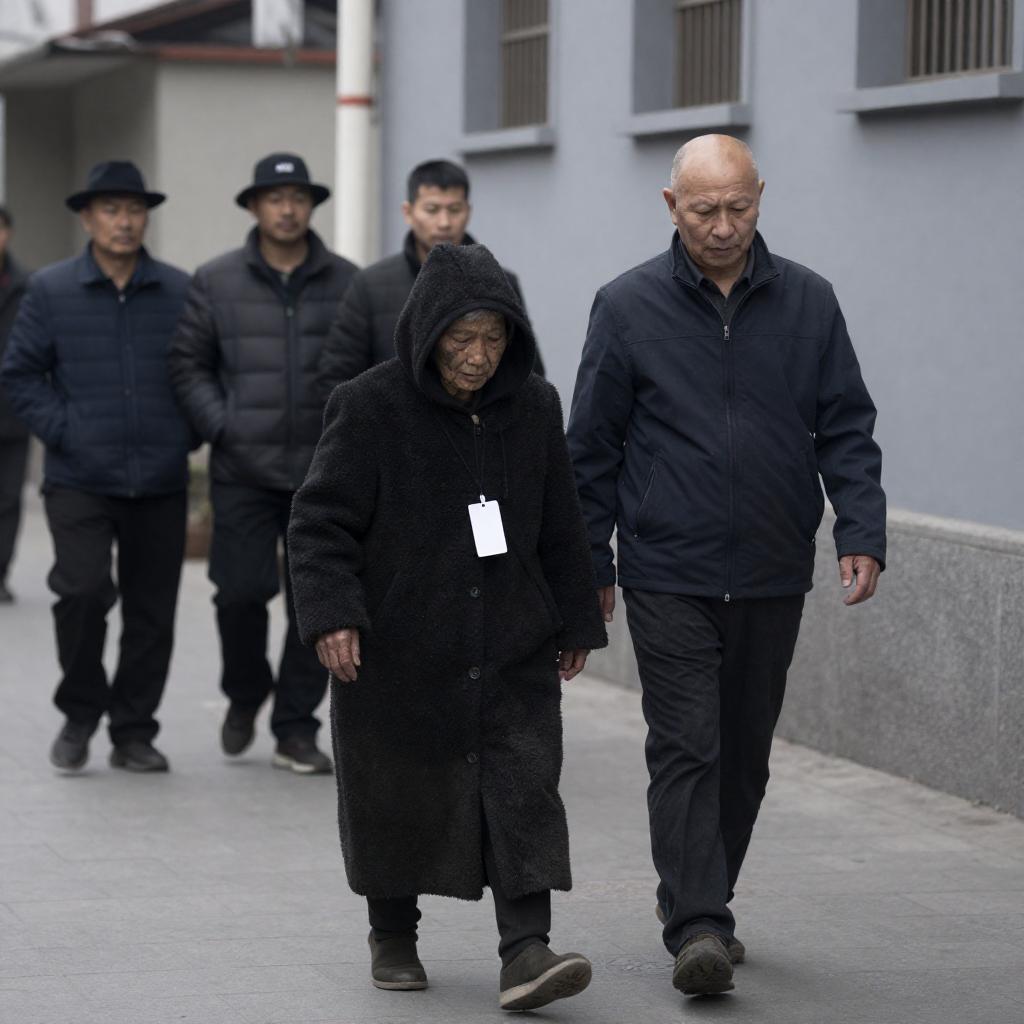 Photograph of a street scene. Elderly woman with black hooded cloak, dirty face, and white tag walks beside bald man in dark jacket. Three men in background wear jackets and hats. Smoky atmosphere, grey building wall on right.