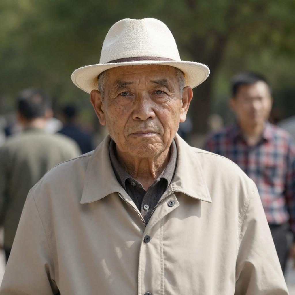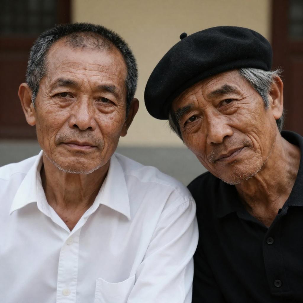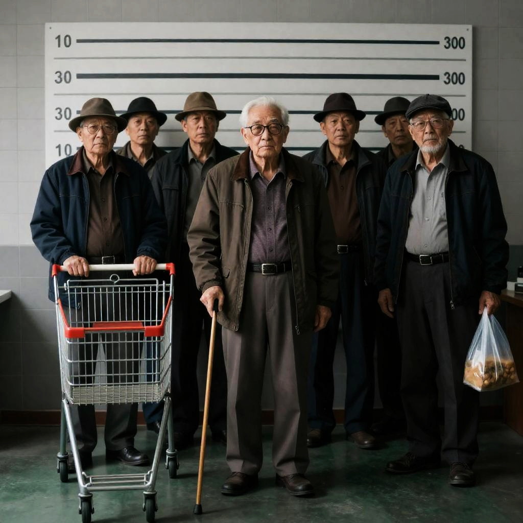 Photograph of a street scene. Elderly woman with black hooded cloak, dirty face, and white tag walks beside bald man in dark jacket. Three men in background wear jackets and hats. Smoky atmosphere, grey building wall on right.