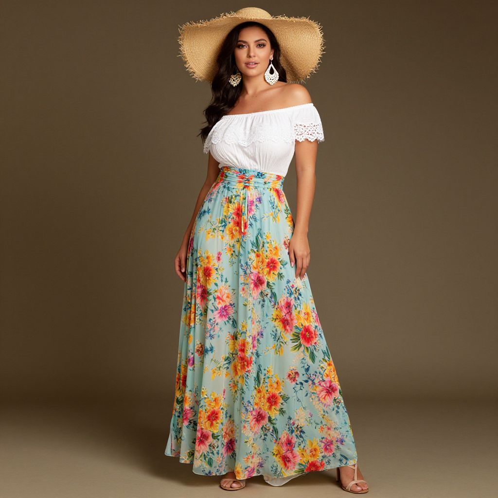 Full body shot, Busty woman, off-shoulder white cotton top, delicate lace trim, fitted bodice, flowing maxi skirt, vibrant floral print, lightweight chiffon fabric, high-waisted design, cinched waist, ankle-length hem, strappy nude sandals, oversized straw hat, statement earrings, bohemian vibe, soft natural makeup, sun-kissed glow Sexy. Pretty face and beаutiful eyes. Big breasts