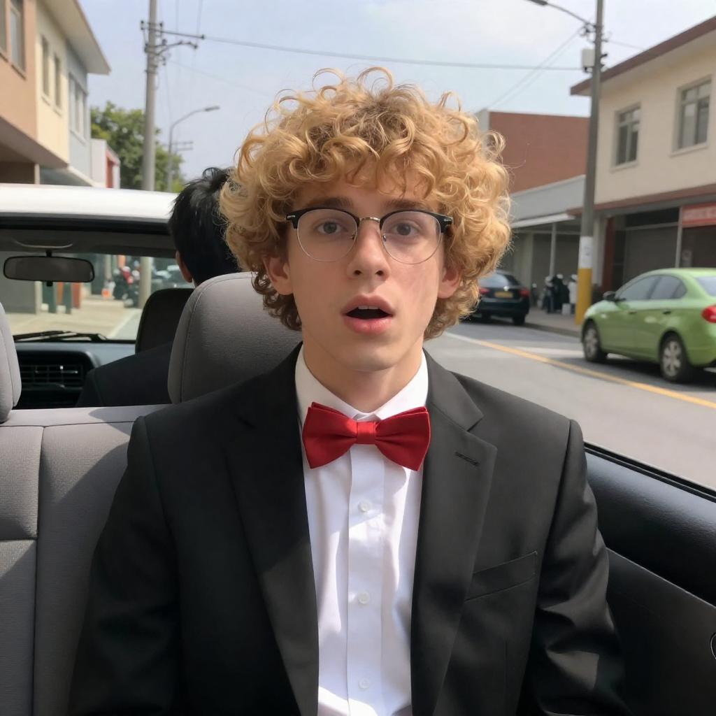 Photograph of a young man with curly blond hair and glasses, wearing a black suit, white shirt, and red bow tie, sitting in the front seat of a car, mouth open in surprise. Another person is partially visible behind him. Urban street with buildings, power lines, and a green car in the background. Bright daylight.