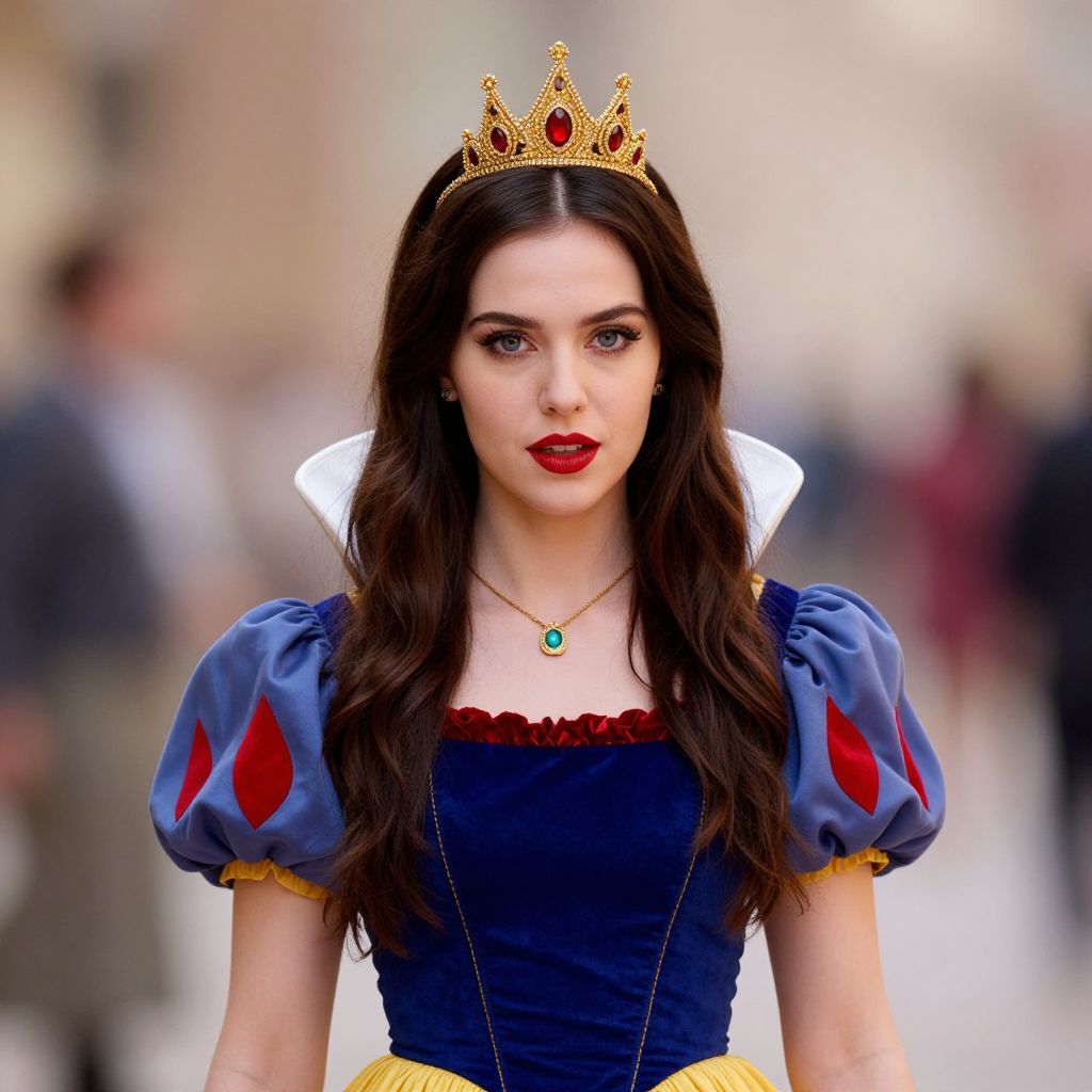 Photograph of a young woman with long, wavy brown hair, wearing a Disney-style Snow White costume. She has fair skin, red lipstick, and dark eyeliner. She wears a gold crown with red and green jewels, a blue dress with puffed sleeves, red diamond shapes, and a white collar. A green pendant necklace rests on her chest. The background is blurred, with indistinct people and light-colored buildings. The image has a vivid, colorful, and slightly surreal quality, emphasizing her costume and expressive face.
