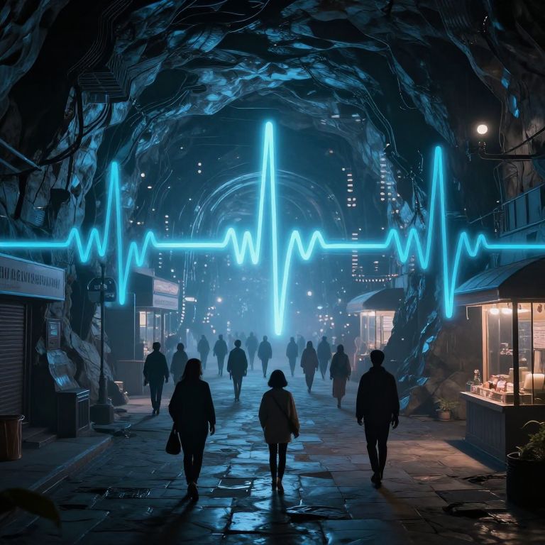 A subterranean city pulses with the synchronized heartbeats of its inhabitants, orchestrating daily rhythms through collective cardiac energy.