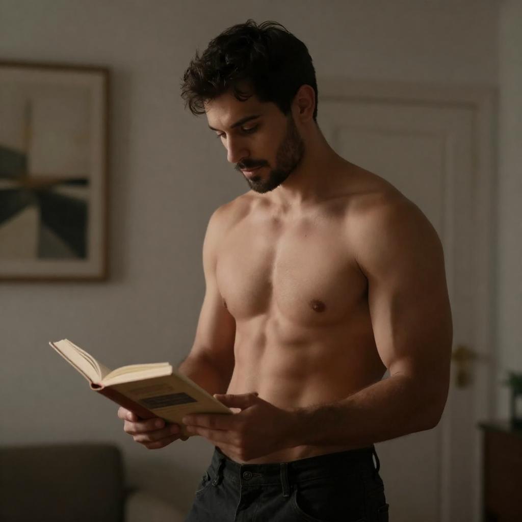 A shirtless, muscular man with short brown hair and a beard sits cross-legged on a cluttered floor, hugging a black object. Surrounding him are scattered books, colorful boxes, and papers. Behind him, shelves filled with more books and a camera are visible. The setting is a messy, book-filled room.