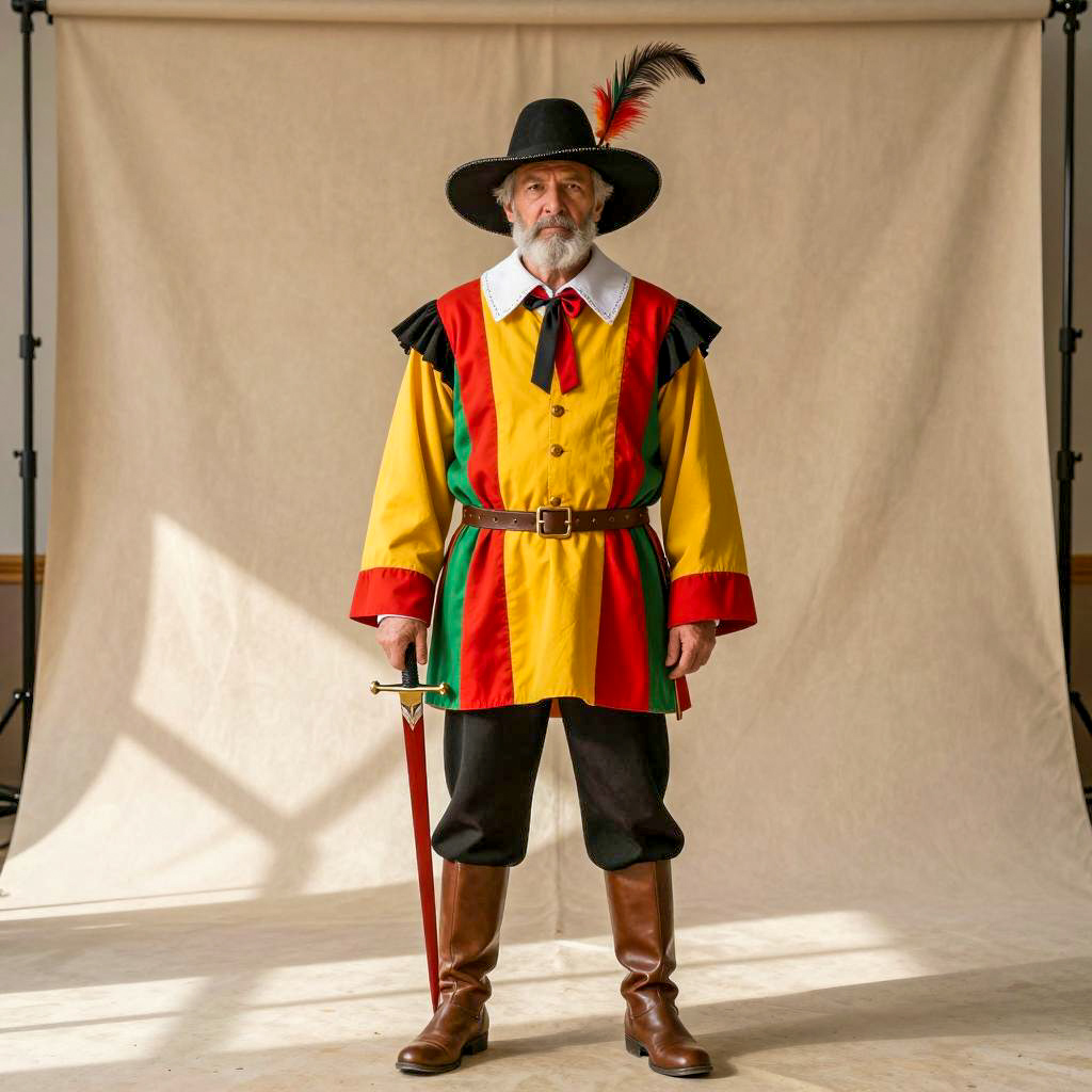 Eleven costume adult, photograph of an old man in historical clothing, standing in front of a beige draped background, wearing a wide-brimmed hat with a colorful feather, yellow and red robe with green and black accents, black pants, brown leather boots, holding a red sword, sunlight casting shadows, realistic, detailed, natural light, studio setting