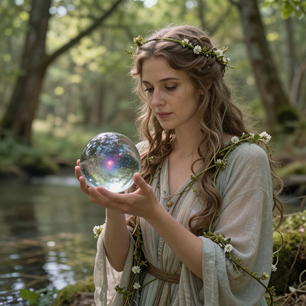 Photograph of a young Caucasian woman with long, wavy brown hair adorned with a crown of small white flowers, standing by a forest stream. She wears a light, flowing, beige dress with wide sleeves and a brown belt. She gently holds a transparent, crystal-like ball that reflects light, positioned just below her chin. The background is a lush, green forest with sunlight filtering through the trees, creating a serene, magical atmosphere. The woman's expression is calm and contemplative. The image has a soft, ethereal quality.