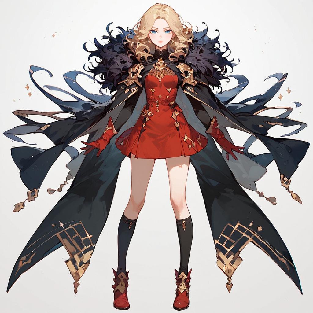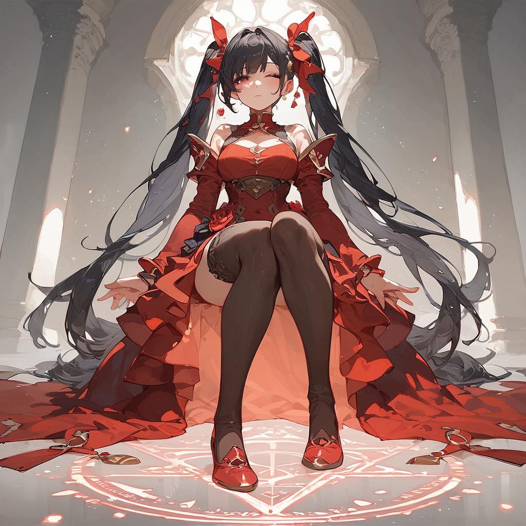 Digital anime-style illustration of a confident young woman standing in a dynamic pose against a simple grey background with a large white circle and red hearts. She has medium-length brown hair, wears black thigh-high stockings with heart motifs, a black dress with long sleeves and red accents, and black sneakers. She holds a large black and red sword, accessorized with matching earrings and a smile.