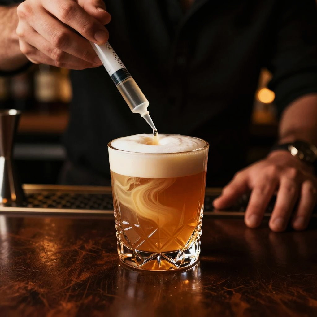 B-52 injection illustrated as a vibrant cocktail mix being prepared in a dimly lit bar, rich amber and cream layers swirling, crystal glass reflecting light, bartender pouring with precision, cinematic shadows and a warm, inviting atmosphere