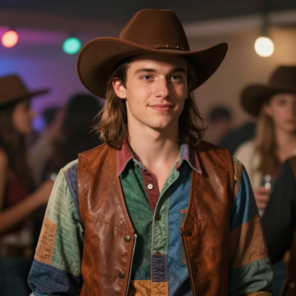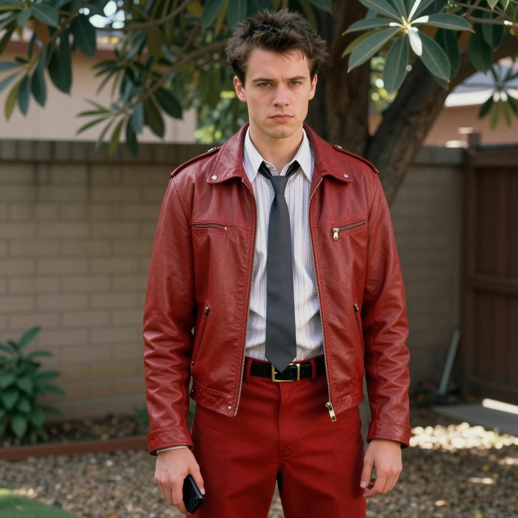 Jules pulp fiction costume, photorealistic photo of a young man standing in a sunlit backyard, wearing a red leather jacket, striped shirt, black and gray tie, and red pants, black belt with gold buckle, holding a black smartphone in right hand, short dark hair, serious expression, green leafy tree in background, beige brick wall, gravel ground, daytime, natural light, mid-90s fashion style