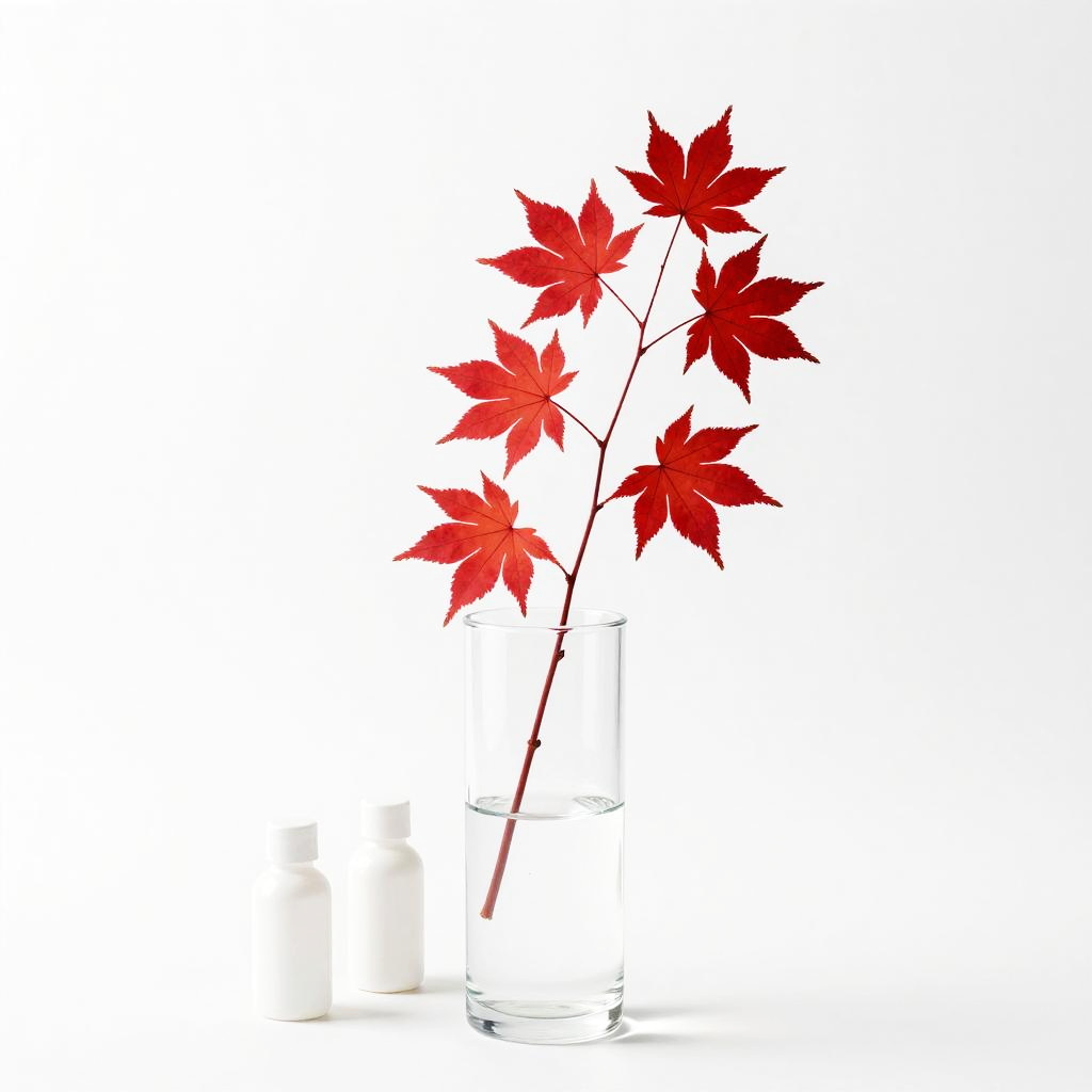 A sharp vector line art featuring a clear cylindrical glass vase holding a single bright red maple leaf branch, on a seamless white background with three small empty white bottles nearby; high contrast, bold accent colors, thin clean lines, balanced composition, generous negative space, soft studio lighting, modern minimalist aesthetic, crisp edges, no text, no watermark