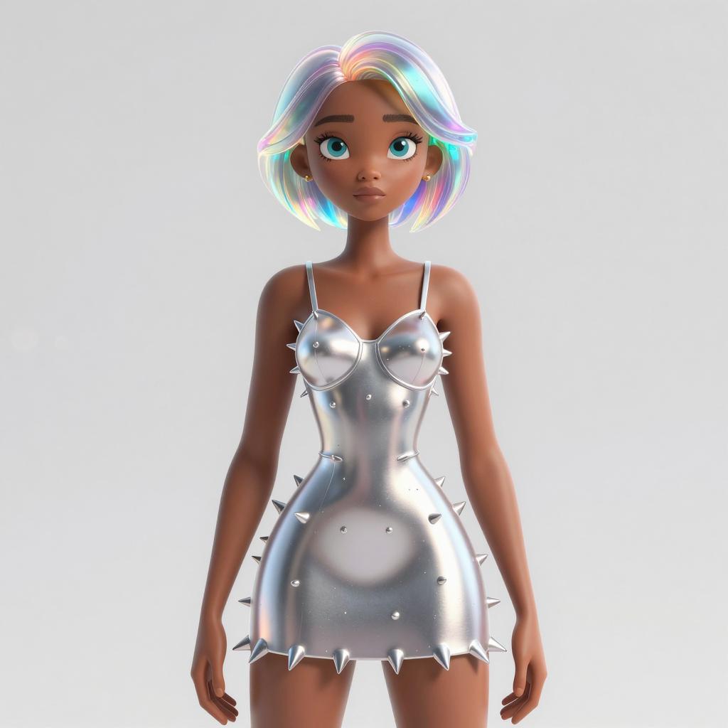 3D digital rendering of a metahuman female model with dark skin and large blue eyes, wearing a futuristic silver spiky mini dress. She has short, iridescent rainbow-colored hair and a neutral expression, posed against a plain white background. The image features high-detail reflective materials and cinematic lighting with soft focus and bokeh effects.