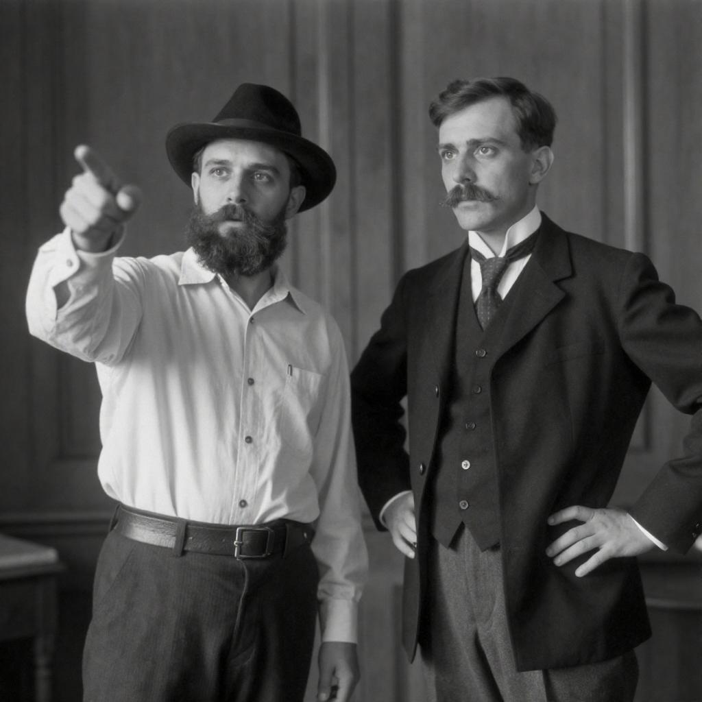 Black-and-white photograph of three men in Victorian attire. Foreground man with curly hair, striped tie, and bowler hat looks to the left. Right man with top hat, mustache, and boutonnière holds a book, smiling slightly. Background man with stern expression stands in window, wearing a dark suit. Window and building wall visible.