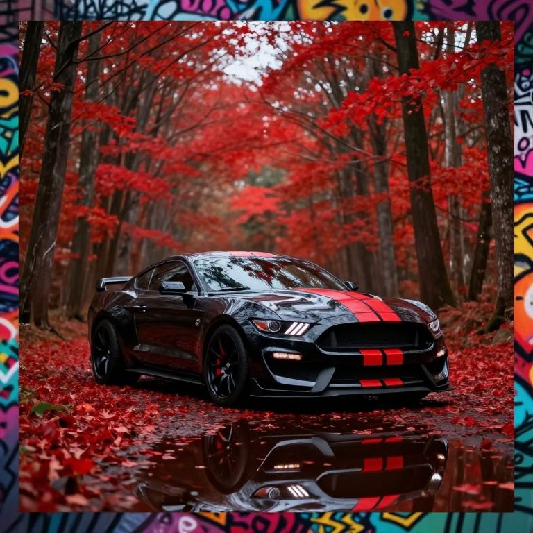 A cinematic, vibrant image featuring a striking Ford Mustang Shelby GT350 parked amidst a serene, autumnal forest, The car, predominantly black with bold red racing stripes on the hood and roof, stands out against the backdrop of tall trees with vibrant red leaves, The Mustang's aggressive stance and wide tires create a powerful, ready-to-pounce appearance, The forest floor is covered in red leaves, reflecting the car's color scheme, and the soft, diffused lighting casts a warm glow throughout the scene, The reflection of the car and trees on the wet ground adds depth and tranquility, The harmonious blend of the car's sporty design and the peaceful, natural setting evokes feelings of power and serenity, capturing a moment of pause amidst a high-energy environment, The image is enhanced by a graffiti-style border, vibrant, graffiti, cinematic