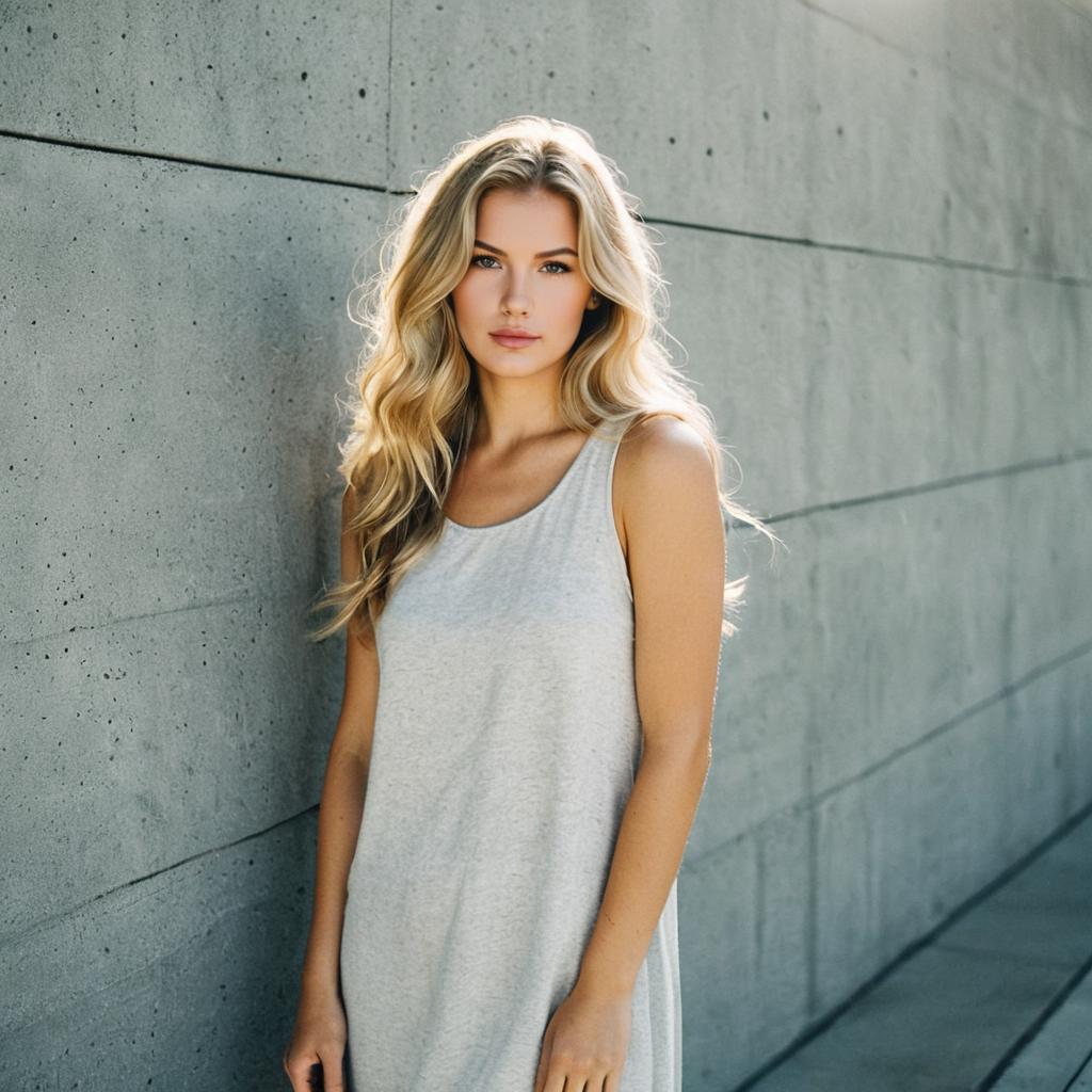 Photorealistic image of a young light-skinned woman with an athletic build, wearing a blue sports tank dress with pink trim. She stands against a raw concrete wall background with natural light casting soft shadows. Her hair is tied in a ponytail, and she has a neutral expression. The dress is slightly loose with a minimalistic style.