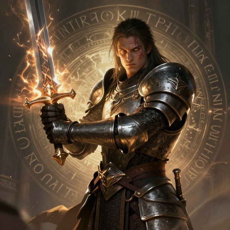 This digitally rendered image depicts a fierce, dark-haired warrior in medieval-style silver armor, gripping a sword with a fiery blade. The warrior's intense gaze is directed forward, with a scar visible on his left cheek. The armor is detailed with intricate engravings and has a reflective, metallic sheen. The background features a glowing, circular, mystical emblem with Latin text, adding a magical or ancient feel. The overall color palette is dark, with warm, golden flames contrasting against the cool metallic tones of the armor. The image combines elements of fantasy and realism, highlighting the warrior's strength and determination.