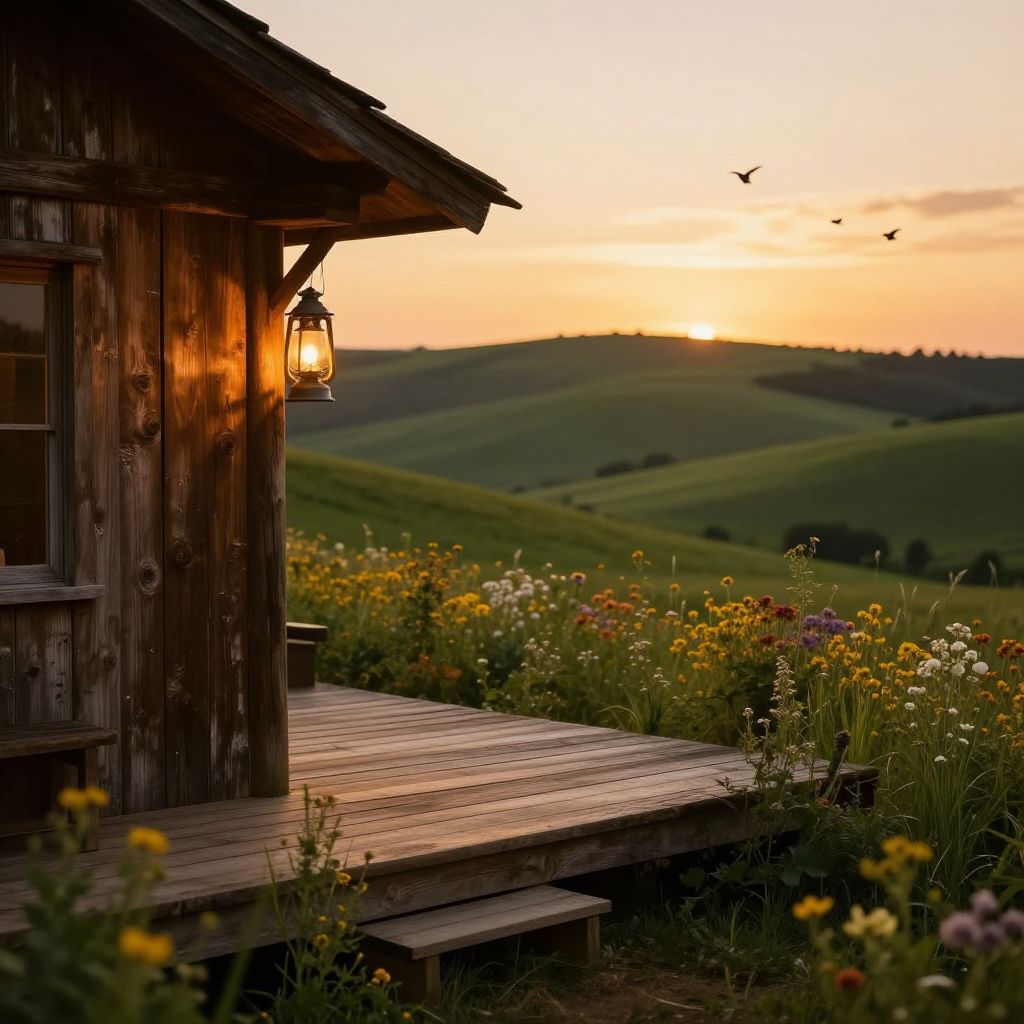 Photograph of a rustic wooden cabin at sunset, featuring a lit lantern on the left. The cabin has weathered wood and a small, wooden porch with steps. Surrounding the porch is a vibrant, wildflower-filled garden. In the background, rolling green hills stretch under a golden-orange sky, with a few birds flying. The sunlight casts a warm glow over the scene, enhancing the textures of the wood and flowers. The overall mood is peaceful and serene.