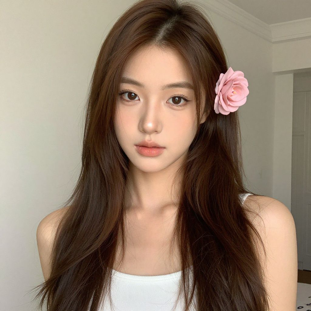 Photograph of an East Asian woman with fair skin and long, straight, dark brown hair. She has large, almond-shaped brown eyes and wears a delicate pink rose hairpin on the right side of her head. She is dressed in a simple, white, sleeveless top. The background is a plain, white-walled room with a partially visible door on the right. The lighting is soft and natural, highlighting her youthful and serene facial expression. The overall style is minimalistic and focused on her delicate beauty.