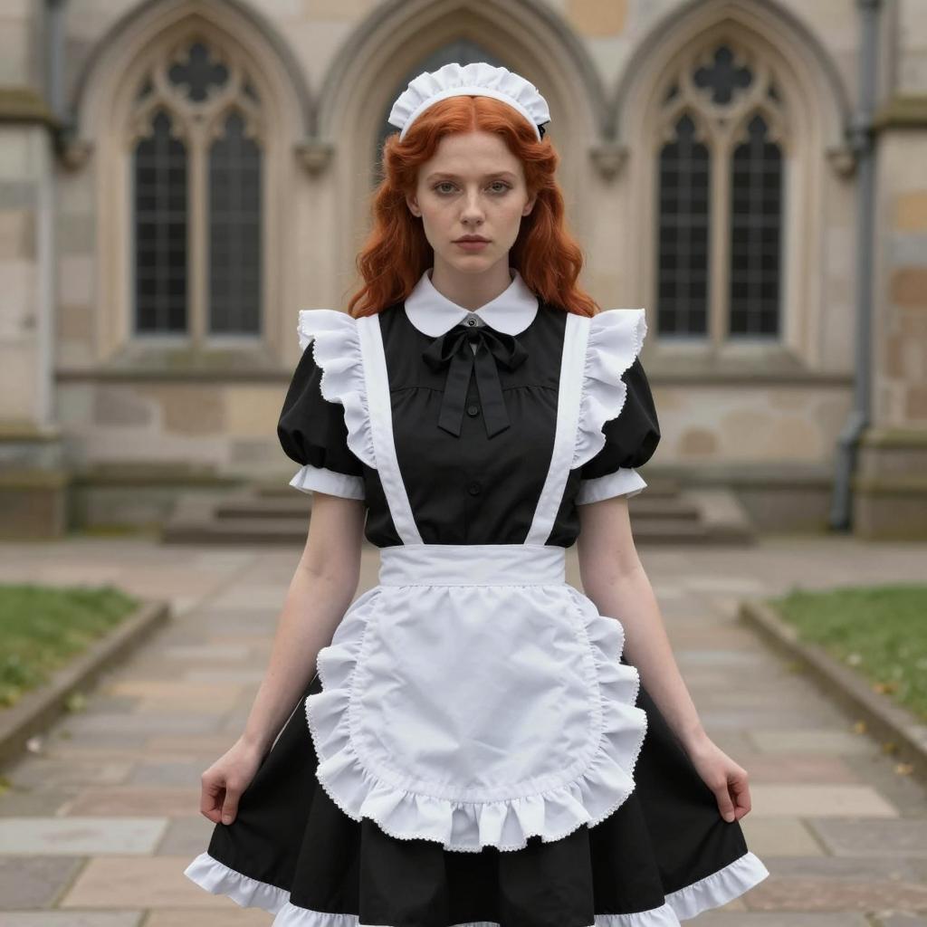 Victorian style maid outfit, photograph of a young woman, standing in an elegant room, wearing a traditional French maid outfit, maroon dress with white lace trim, black bow tie, white apron, white headband, brown curly hair in two buns, fair skin, blue eyes, neutral expression, background with floral-patterned wallpaper, table with white cloth, vase of orange and white flowers, soft natural light, realistic, detailed ures, classic and vintage style, slightly formal and refined setting