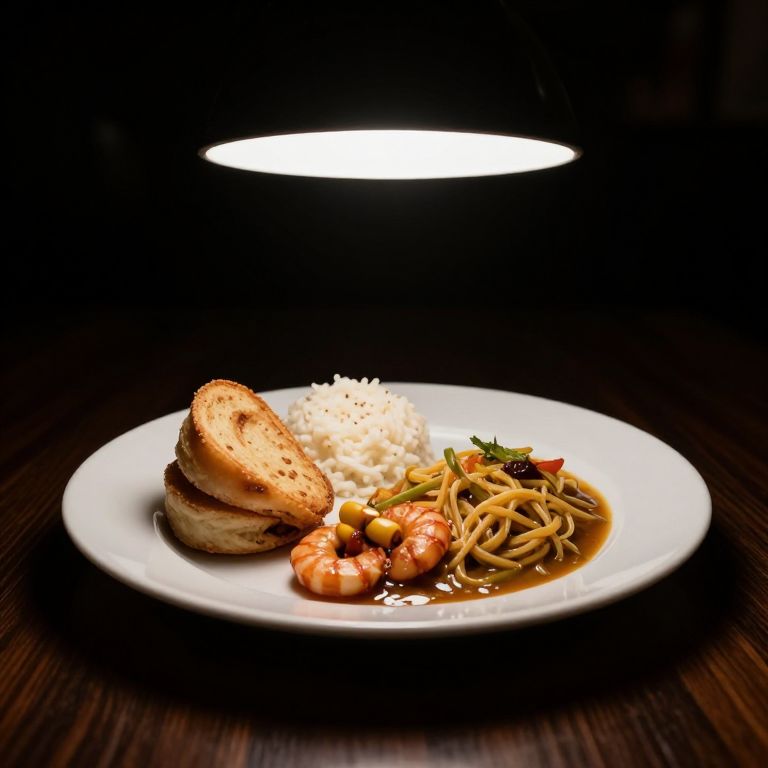 Photograph of a white plate with a three-course meal set against a dark background with a bright spotlight above. The plate features a golden-brown, round sandwich with visible seeds, a mound of white rice sprinkled with black pepper, and a serving of stir-fried noodles with shrimp, green bell peppers, and a light brown sauce. The dark wood table beneath the plate adds contrast to the bright, illuminated food. The image has a high-contrast, dramatic lighting effect.