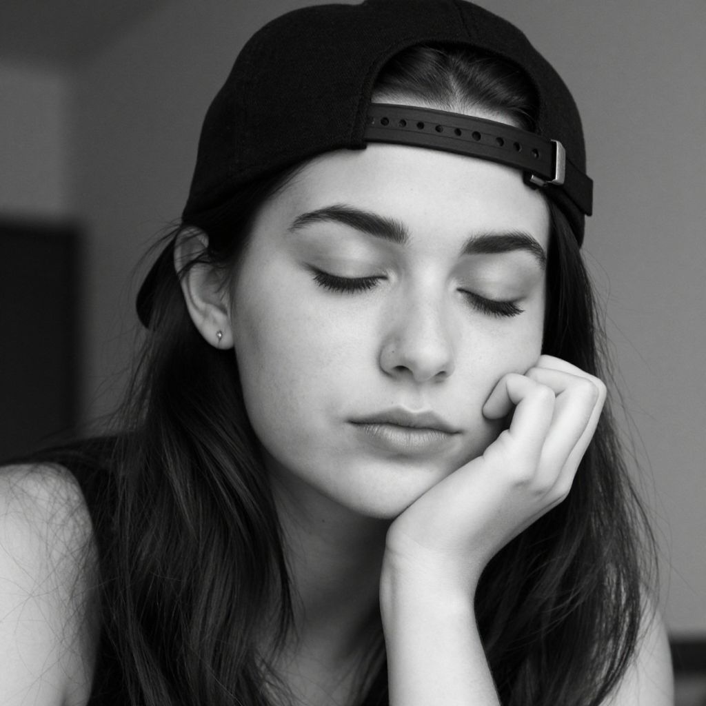 Black and white photo of a young woman with long dark hair, wearing a backward black baseball cap. She's resting her head on her hand with her eyes closed, giving a relaxed vibe. Her eyebrows are thick and well-defined, and she has a subtle, natural makeup look. The background is blurred, emphasizing her contemplative pose. The overall style is casual and edgy.