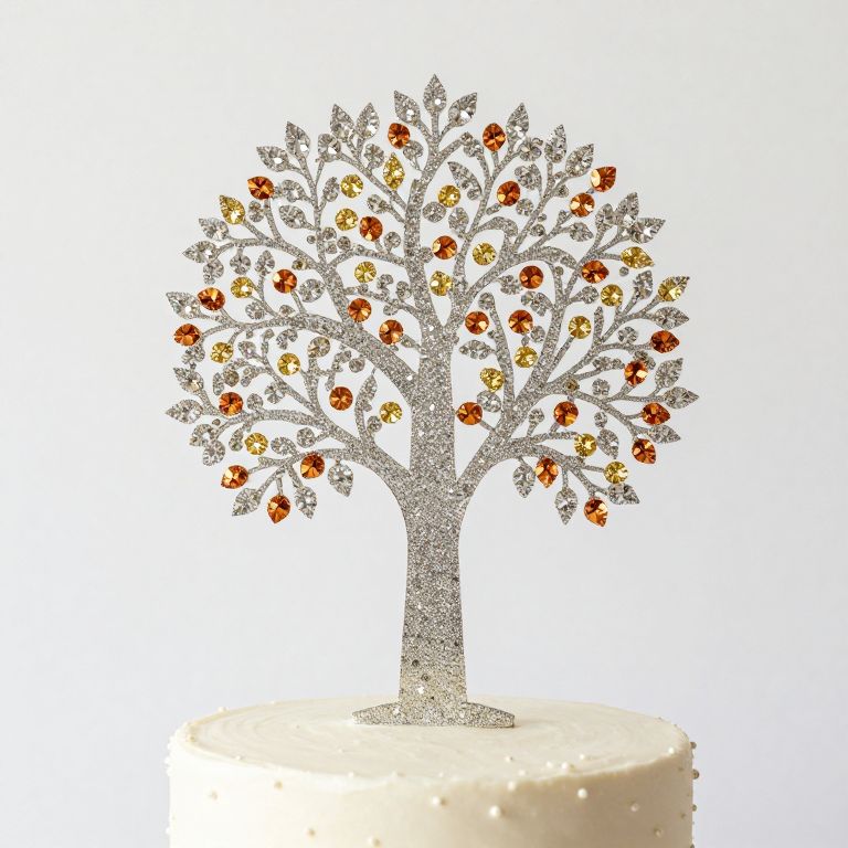 Silver glitter tree-shaped wedding cake topper adorned with copper, gold, and silver Swarovski crystal elements. The topper features intricate branches and leaves, placed on a white frosted cake. Designed as a custom centerpiece or cake decoration for weddings without figurines.