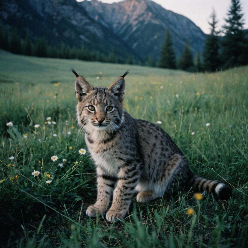 Fujifilm Pro 400H cinematic film still of lynx kitten parked in mountain meadow during twilight.